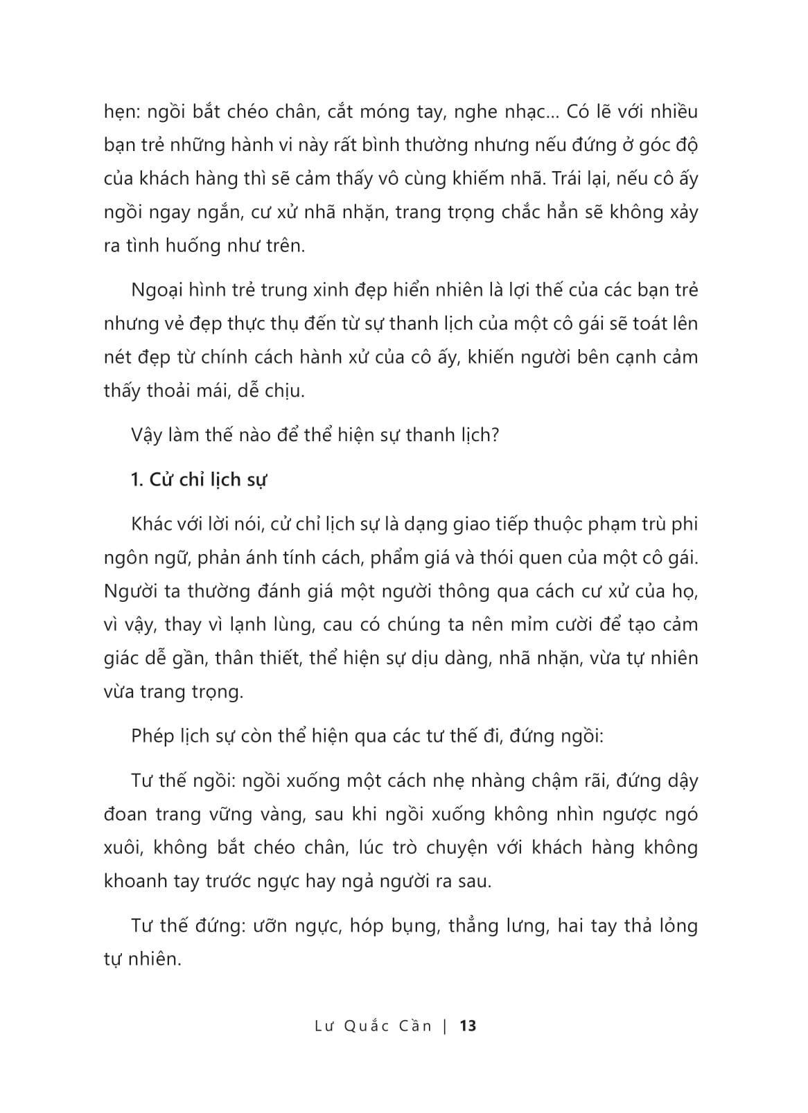 Một Cuốn Sách Lễ Nghi Hữu Dụng Dành Cho Các Cô Gái - 70+ Quy Tắc Xã Giao Thanh Lịch Của Quý Cô Hiện Đại Đã bao giờ bạn tự hỏi điều gì khiến một cô gái có thể lưu lại dấu ấn khó phai trong lòng người khác? Là một khuôn mặt được trang điểm kỹ càng, những bộ cánh thời thượng, ấn tượng? Những điều thuộc về yếu tố bên ngoài chỉ giúp chúng ta xây dựng ấn tượng đầu tiên tốt đẹp trong mắt người khác. Nhưng yếu tố góp phần nâng tầm giá trị của một cô gái là “lễ nghi” – bộ quy tắc hành xử chuẩn mực, có văn hóa, thể hiện nét đẹp thanh lịch, duyên dáng của người phụ nữ. Cuốn sách trang bị cho bạn kiến thức cơ bản về quy tắc ăn mặc, ứng xử và đối đãi trong các tình huống: phỏng vấn xin việc, mở rộng mối quan hệ, ra mắt người thân, tham gia các bữa tiệc quan trọng, để biểu hiện tốt nhất trong các tình huống ứng xử xã hội, dù là gặp mặt trực tiếp hay trao đổi qua mạng, giúp tôn vinh nét duyên dáng và lợi thế nữ tính của các cô gái, tạo nên dấu ấn của một người con gái có tu dưỡng tốt. Các mối quan hệ dù là cấp trên - cấp dưới, nhân viên – khách hàng hay bố mẹ - con cái, người yêu với nhau cũng đều cần những quy chuẩn ứng xử phù hợp, tôn trọng ranh giới cá nhân của mỗi người. Làm chủ được “lễ nghi” không chỉ giúp các cô gái được đánh giá cao về sự tu dưỡng mà còn tránh được những khoảnh khắc “hớ hênh” khó xử, đánh mất cơ hội gặp gỡ “quý nhân” hay những lời đề nghị hợp tác quý giá. “Trên đời này mọi việc đều bắt đầu từ chữ ‘lễ’. Nếu không có ‘lễ’ bạn sẽ chẳng làm được việc gì. Trái lại, nếu bạn là người hiểu lễ nghi, đó chắc chắn là ‘vốn liếng’ tuyệt vời để bạn xây dựng tên tuổi và đạt thành tựu lớn trong cuộc sống.” – Lư Quắc Cần Về tác giả: Lư Quắc Cần là nữ tác giả sách Trung Quốc, chuyên gia làm đẹp cao cấp, huấn luyện viên về nghi thức được Ủy ban Giáo dục Nhân tài Chuyên nghiệp Trung Quốc chứng nhận. Chuyên môn của cô là đào tạo về nghi thức cho các doanh nghiệp, khách sạn 5 sao, các tổ chức trên toàn quốc và tư vấn xây dựng hình ảnh cá nhân.