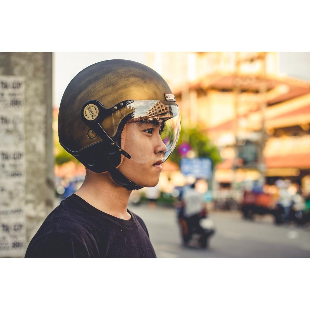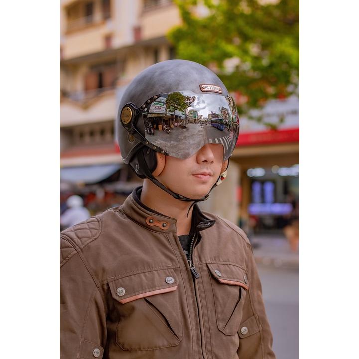 THIẾT KẾ THÔNG MINH - Phong cách thiết kế: mũ kiểu 3/4 kèm kính dài, mũ được thiết kế dáng tròn, đi kèm 2 miếng ốp má, giúp tăng thêm hiệu quả bao phủ, bảo