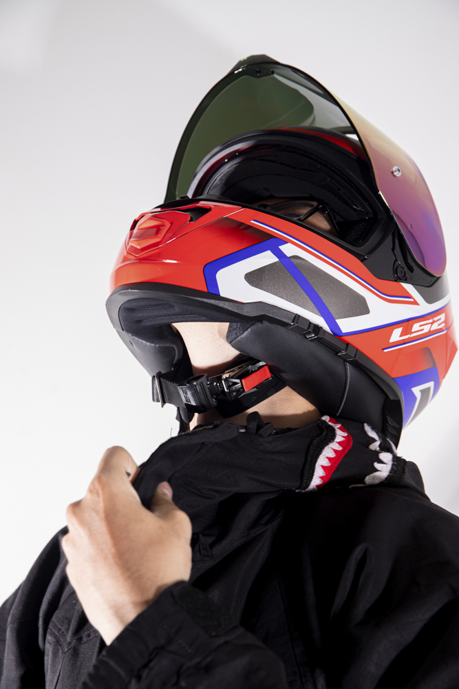 Mũ Fullface LS2 FF800 STORM sử dụng khóa lẫy làm từ hợp kim thép không gỉ chắn chắn, dễ dàng điều chỉnh độ rộng của dây đeo. Để mở khóa, bạn chỉ cần kéo lẫy màu đỏ rất dễ dàng. Ngoài ra, dây đeo được bao phủ thêm miếng lót cằm giúp người đội thoải mái, có thể tháo rời để giặt.