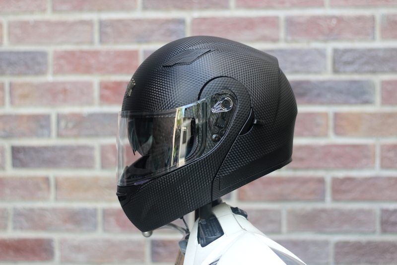 Royal M179 với thiết kế lật hàm sơn vân carbon vô cùng độc đáo giúp ae linh động thay đổi từ một chiếc fullface sang kiểu 3/4 khá dễ dàng. Vỏ bằng nhựa ABS nguyên