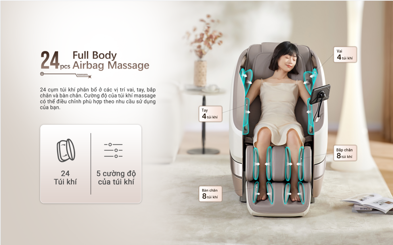 Ghế được trang bị 24 túi khí trải dài toàn thân với 5 cường độ, mọi bộ phận trên cơ thể bạn sẽ đều được massage một cách hiệu quả và chuyên sâu.