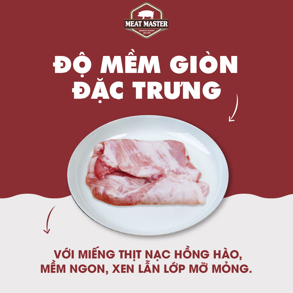 Nạc giòn heo Meat Master là phần thịt quý và độc đáo, với từng thớ thịt nạc xen kẽ vân mỡ, được thái lát mỏng thành miếng, vừa mềm mại vừa giòn tan.