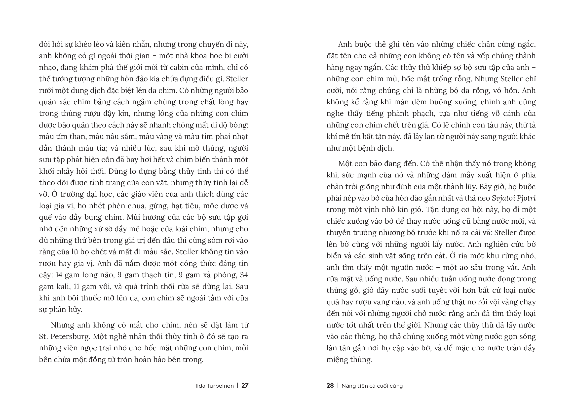Nàng Tiên Cá Cuối Cùng là một hành trình xuyên thời gian và không gian, nơi số phận con người và tự nhiên đan xen trong những trang sử đầy ám ảnh. Cuốn sách dẫn từ chân dung của một loài vật để mở ra chuyến phiêu lưu choáng ngợp xuyên suốt ba thế kỉ, kể lại những mộng ước lớn lao của con người: về khoa học, nghệ thuật và khao khát phục sinh những gì chính tay nhân loại đã hủy diệt. Trong Nàng Tiên Cá Cuối Cùng, nhà văn Iida Turpeinen đã dẫn dắt người đọc tiến vào chuyến thám hiểm tìm hiểu những tác động của con người lên thế giới tự nhiên, trọng tâm là sự tuyệt chủng của loài bò biển Steller.
