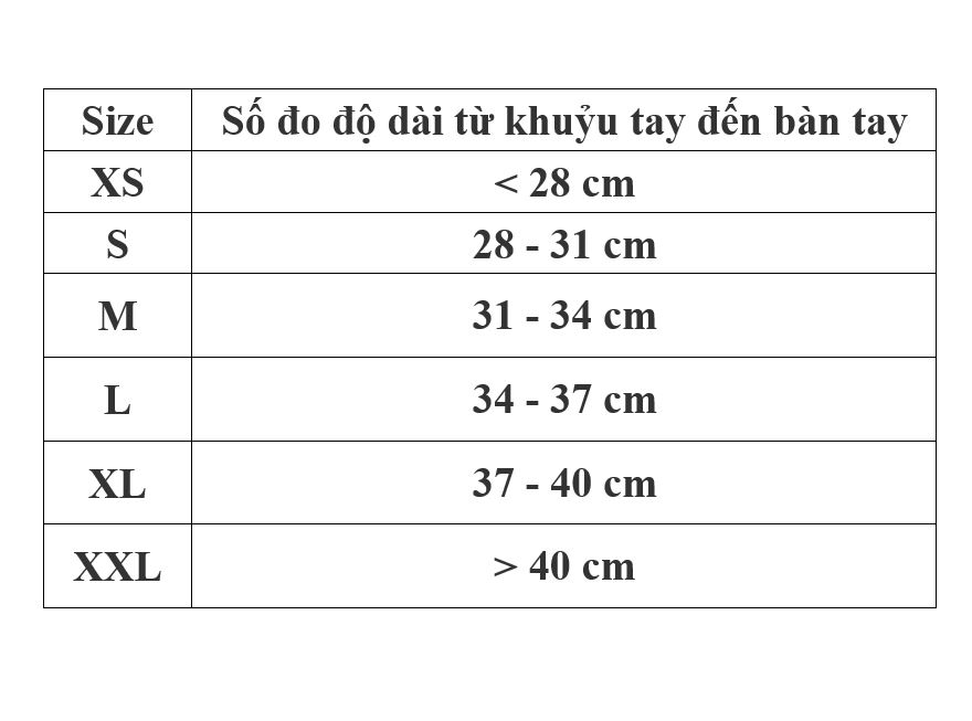 - Kích cỡ sản phẩm: XXS, XS, S, M, L, XL CHỨC NĂNG: - Cố định 1/3 dưới xương cánh tay, xương cẳng tay và khớp khuỷu. CHỈ ĐỊNH SỬ DỤNG: