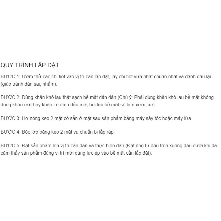 - Ốp Chống Trầy Cốp Xe có sẵn phần keo dán 2 mặt 3.M ở sau giúp khách có thể lắp đặt ngay tại nhà mà ko cần tốn thêm 1 phần chi phí nào cả Hướng dẫn lắp đặt: Nẹp cốp, Ốp chống trầy cốp trong, ngoài xe Ford Territory 2022 2023 mẫu Titan, chống xước cửa xe ️ BƯỚC 1 : Ướm thử các chi tiết vào vị trí cần lắp đặt, lấy chi tiết vừa nhất chuẩn nhất và đánh dấu lại ( giúp tránh dán sai, nhầm) ️ BƯỚC 2 : Dùng khăn khô lau thật sạch bề mặt cần dán (Chú ý: Phải dùng khăn khô lau bề mặt không dùng khăn ướt hay khăn có dính dầu mỡ, bụi lau bề mặt sẽ làm xước xe ) ️ BƯỚC 3: Hơ nóng keo 2 mặt có sẵn ở mặt sau sản phẩm bằng máy sấy tóc hoặc máy lửa ️BƯỚC 4: Đặt sản phẩm lên vị trí cần dán và thực hiện dán ( Đặt nhẹ từ đầu trên xuống đầu dưới khi đã cảm thấy sản phẩm đúng vị trí mới dùng lực ép vào bề mặt cần lắp đặt ) Lưu ý: Khi lắp xong đồ ốp ,cần kiêng nước 24 tiếng để đảm bảo sản phẩm ko bị bong tróc