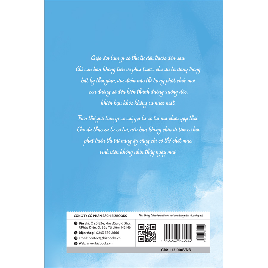 Cuốn sách Nếu Không Tiến Về Phía Trước, Mọi Con Đường Đều Là Xuống Dốc hãy đọc khi bạn mất đi một điểm tựa. Hãy trở thành phiên bản tốt nhất của chính mình với những ước mơ của riêng bạn. Phải luôn nhớ rằng: Tôi trẻ tôi tự do tôi sẵn sàng chiến đấu với những dông tố của cuộc đời.