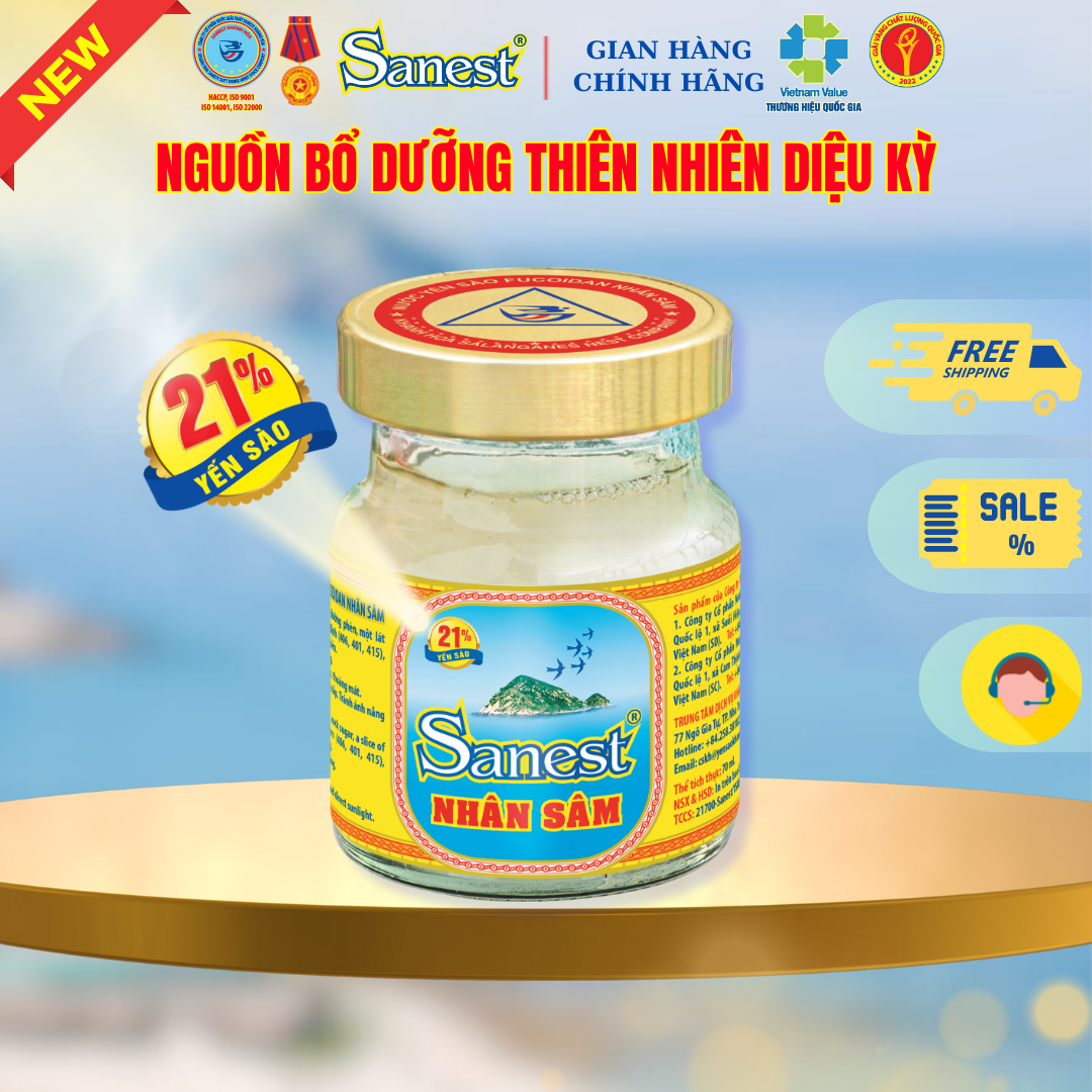 NƯỚC YẾN SÀO KHÁNH HÒA SANEST FUCOIDAN NHÂN SÂM – HÀM LƯỢNG YẾN BỔ SUNG 21% Nư ớc Yến sào Khánh Hòa Sanest Fucoidan Nhân sâm được sản xuất từ nguồn Yến sào thiên nhiên