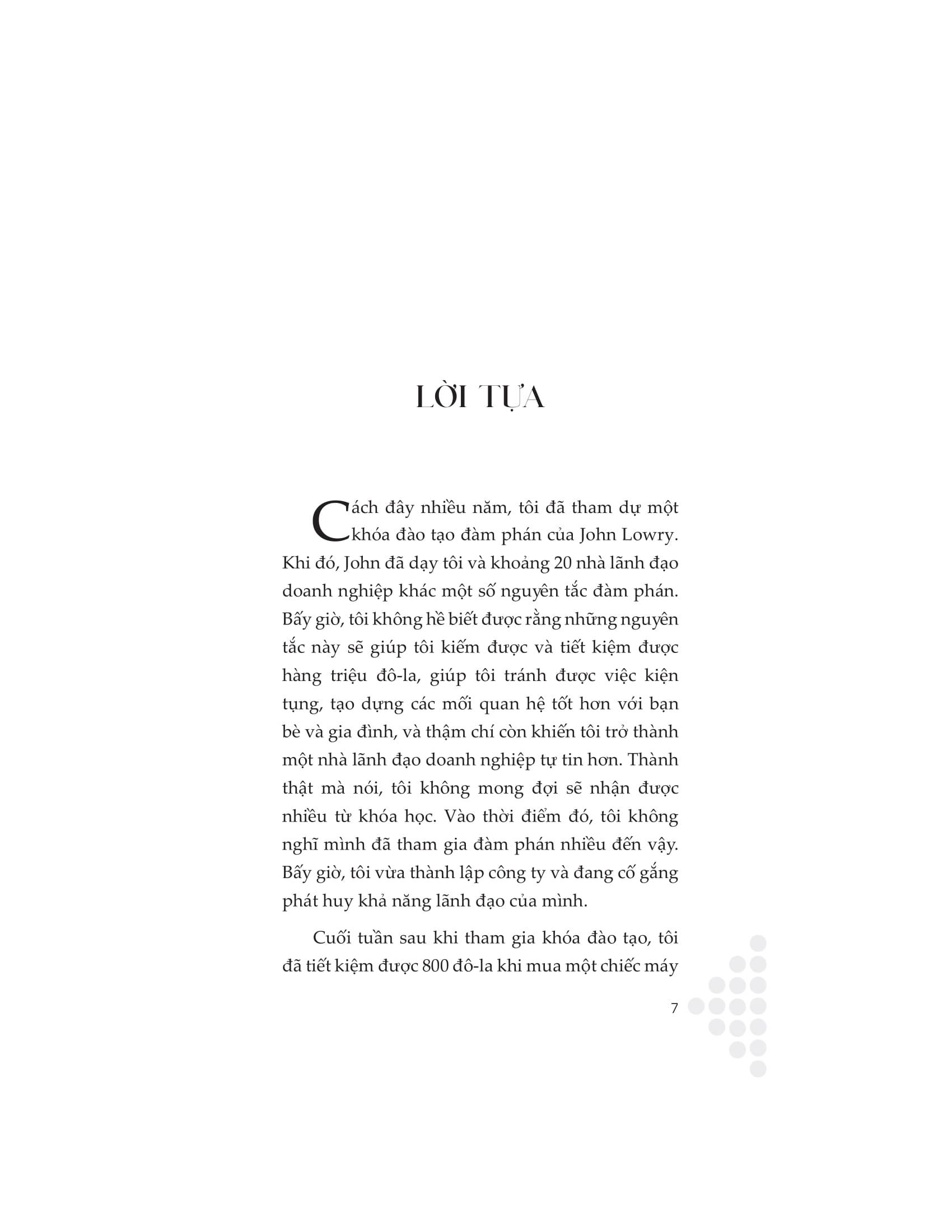 Sự thật là các nhà lãnh đạo doanh nghiệp và tổ chức dành hơn một nửa thời gian làm việc của m.ình để tham gia vào quá trình đàm phán. Đây là cách họ thực hiện các thỏa thuận, lãnh đạo nhân viên và quản lý các mối quan hệ. Hầu hết các nhà lãnh đạo học cách đàm phán trong công việc thông qua một quá trình thực hành và tự rút ra lỗi sai của m.ình. Trong thị trường cạnh tranh ngày nay, không có thời gian để thử nghiệm, cũng không có chỗ để mắc lỗi.