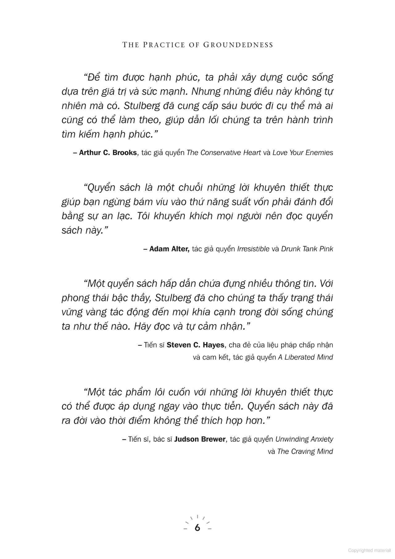 Những nguyên tắc mà Stulberg nhắc đến bao gồm: thái độ chấp nhận, khả năng chú tâm vào hiện tại, lòng kiên nhẫn, tính dễ tổn thương, tính cộng đồng sâu sắc và hoạt động vận động thể chất. Điều thú vị là các nguyên tắc này sẽ bổ trợ cho nhau, giống như cách những cụm rễ liên kết với nhau giữ cho cây tùng bách to cao trụ vững trên mặt đất.
