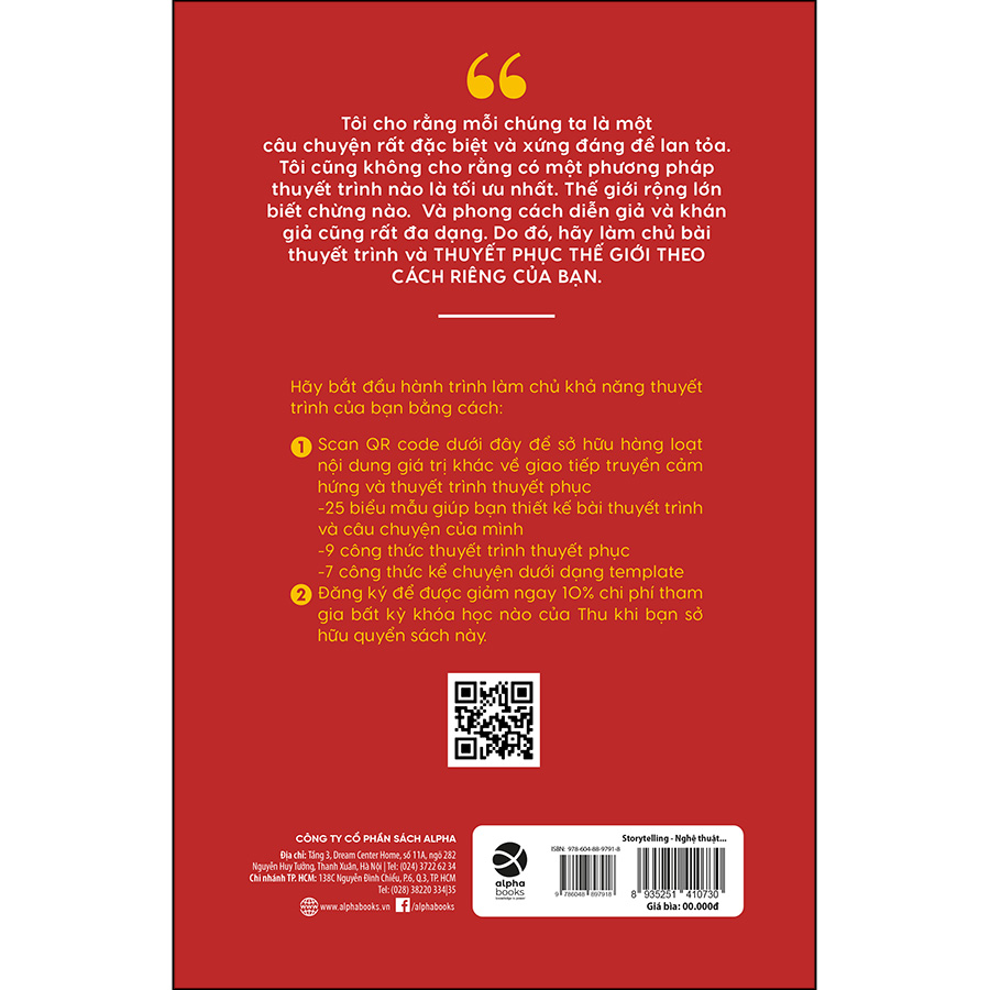 - Giảng viên của nhiều khóa học về nghệ thuật thuyết trình bằng câu chuyện. GIỚI THIỆU TÁC PHẨM Nghệ Thuật Thuyết Trình Bằng Câu Chuyện ( Sách Bản Quyền )Hãy thuyết phục thế giới bằng cách riêng của bạn Cuốn sách này sẽ giúp các bạn chứng kiến cuộc gặp gỡ lịch sử giữa khoa học thuyết trình và nghệ thuật kể chuyện. Một sự kết hợp đầy tương phản nhưng lại bổ trợ mãnh mẽ cho nhau giữa tư duy lý trí và khoa học xúc cảm. Cuốn sách đã mở ra những quan điểm mới mẻ về thuyết trình bằng câu chuyện, một phương pháp giúp ý tưởng tuyệt vời của bạn lan tỏa rộng khắp. Tác giả tin rằng mỗi người là một câu chuyện rất đặc biệt và xứng đáng lan tỏa. Và không có một phương pháp thuyết trình nào là tối ưu nhất. Bởi vì thế giới rộng lớn biết chừng nào, và phong cách của các diễn giả, cũng như nhu cầu của khán giả là rất đa dạng! Do đó, hãy làm chủ bài thuyết trình và THUYẾT PHỤC THẾ GIỚI THEO CÁCH RIÊNG CỦA BẠN. Với những nghiên cứu, học hỏi và ứng dụng vào trong thực tiễn nội dung cuốn sách đã phân tích tập trung vào hai từ khóa chính: Phương pháp thuyết phục khi thuyết trình và nghệ thuật kể chuyện đầy cảm hứng. Các kiến thức và nội dung trong cuốn sách này không dành cho một đối tượng cụ thể hay lĩnh vực cụ thể nào, mà nó dành cho tất cả các độc giả khi muốn thuyết phục một điều gì đó với người nghe. TRÍCH ĐOẠN HAY TRONG SÁCHKhi tôi làm việc với khách hàng cũng như khi chia sẻ trong các chương trình đào tạo về thuyết trình, những câu hỏi tôi thường xuyên nhận được:
