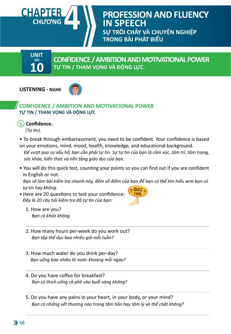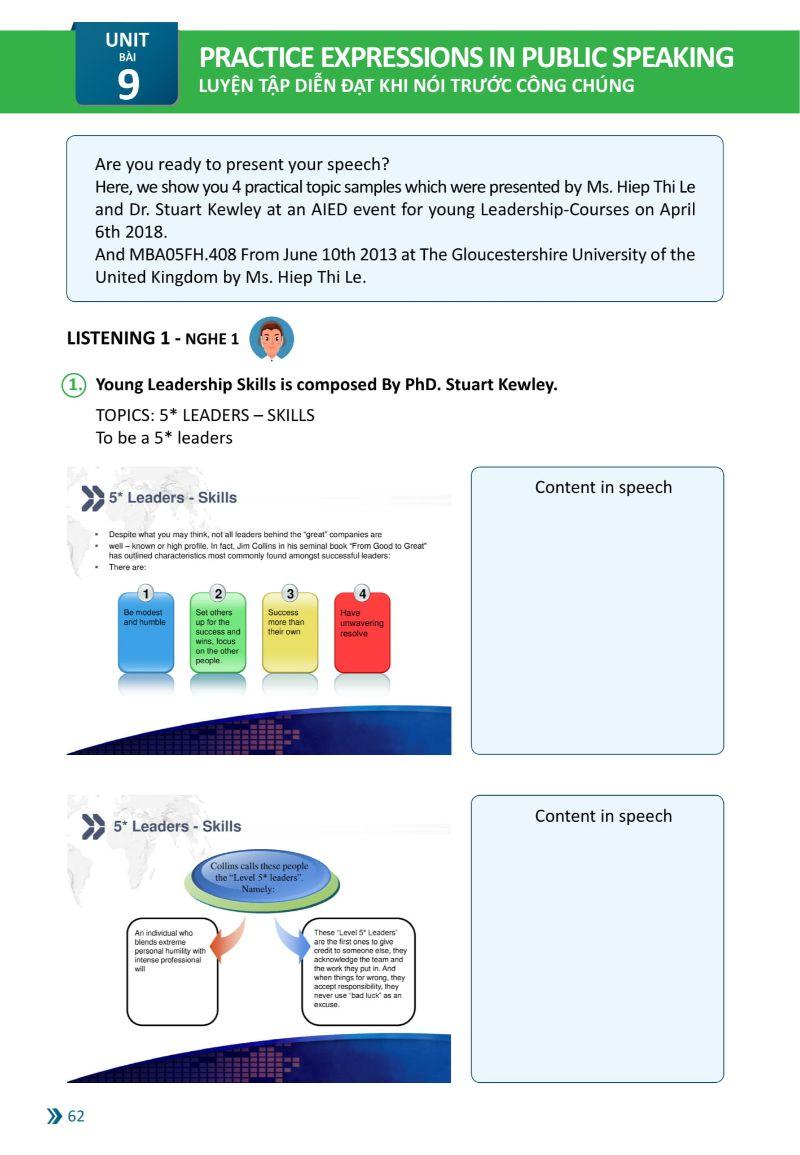 VSTEP - Chinh Phục Kỹ Năng Nói Bậc B1, B2+ Cuốn sách được chia thành 10 bài học, mỗi bài học tập trung vào 1 chủ đề người học thường gặp trong kì thi VSTEP.