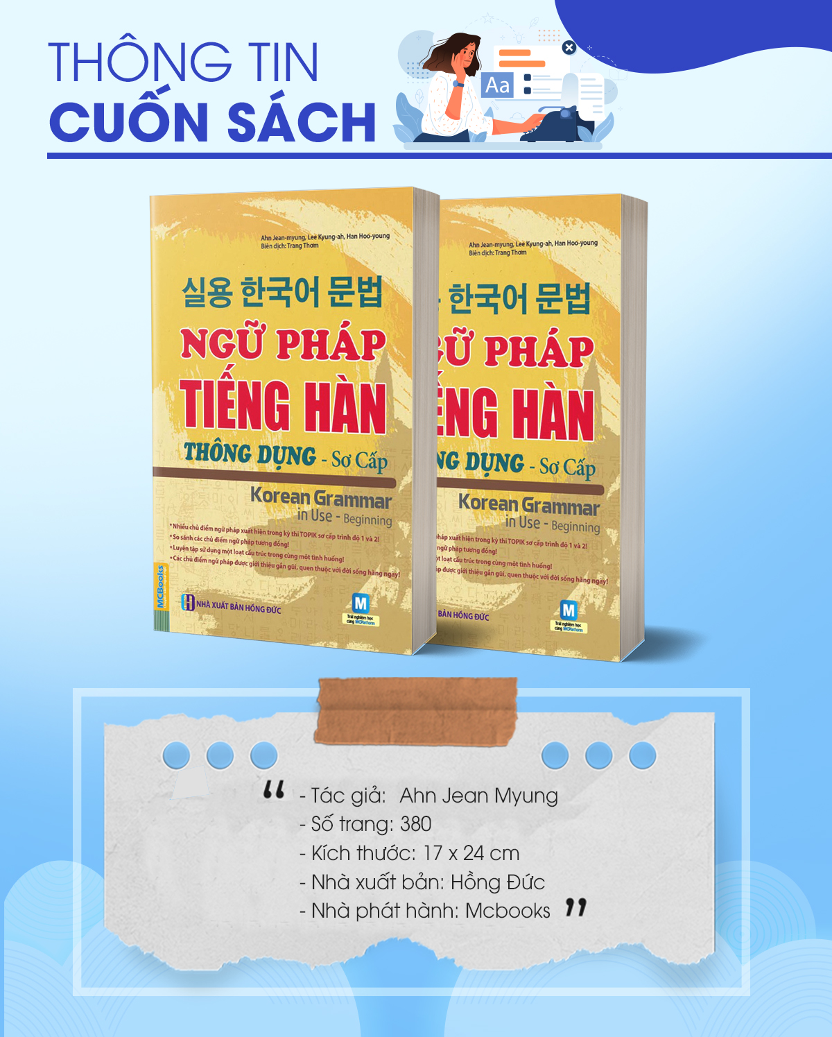 Cuốn sách này được thiết kế hoàn toàn phù hợp với những người mới bắt đầu học tiếng Hàn. Sách gồm có 3 phần chính tổng hợp các kiến thức chính về ngữ pháp tiếng Hàn sơ cấp và thêm nhiều phần kiến thức liên quan: