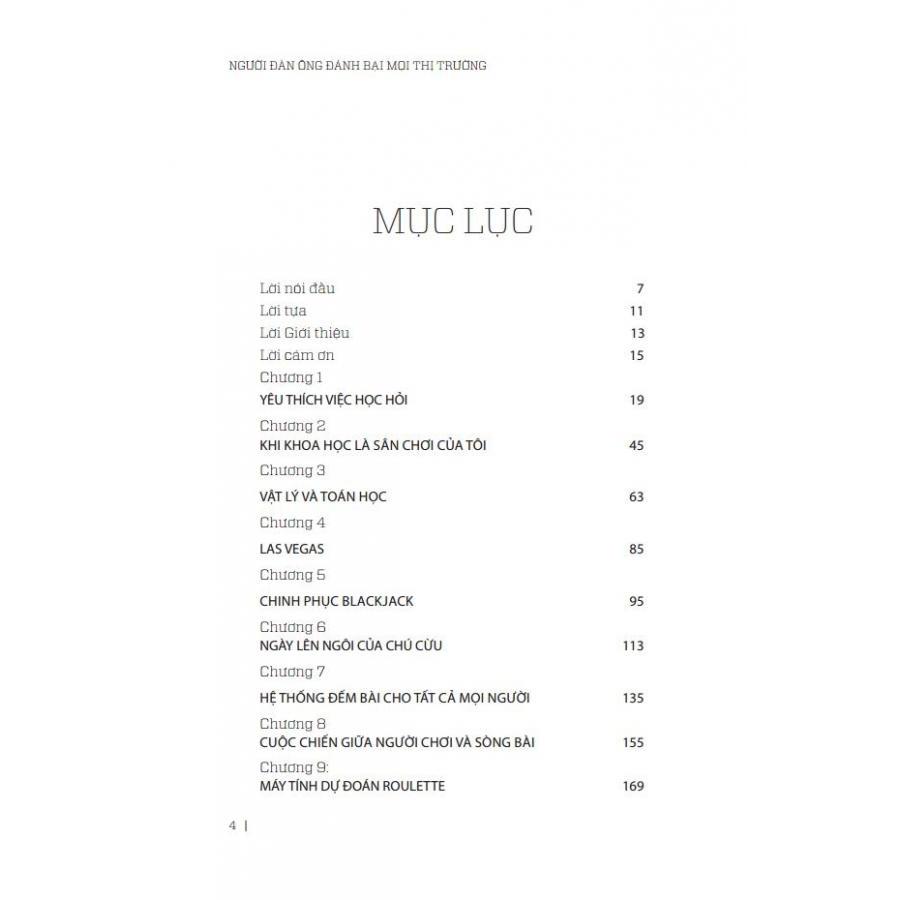 Trong cuốn “Người Đàn Ông Đánh Bại Mọi Thị Trường” (tựa gốc A man for all markets: from Las Vegas to Wall street), lần đầu tiên, quý vị độc giả được nghe Edward Thorp kể về hành trình đi đến đỉnh cao của sự thành công trong sự nghiệp đầu tư của mình. Hành trình được bắt đầu từ những đam mê thời niên thiếu kết hợp với sự tò mò sâu sắc đã dẫn ông tới các công trình nghiên cứu cụ thể, những luận điểm phản biện lại các lý thuyết và các ngộ nhận thông thường trong học thuật. Cuối cùng sao cho hiệu quả là việc ứng dụng những kiến thức này vào thực tiến chơi bài và đầu tư chứng khoán.