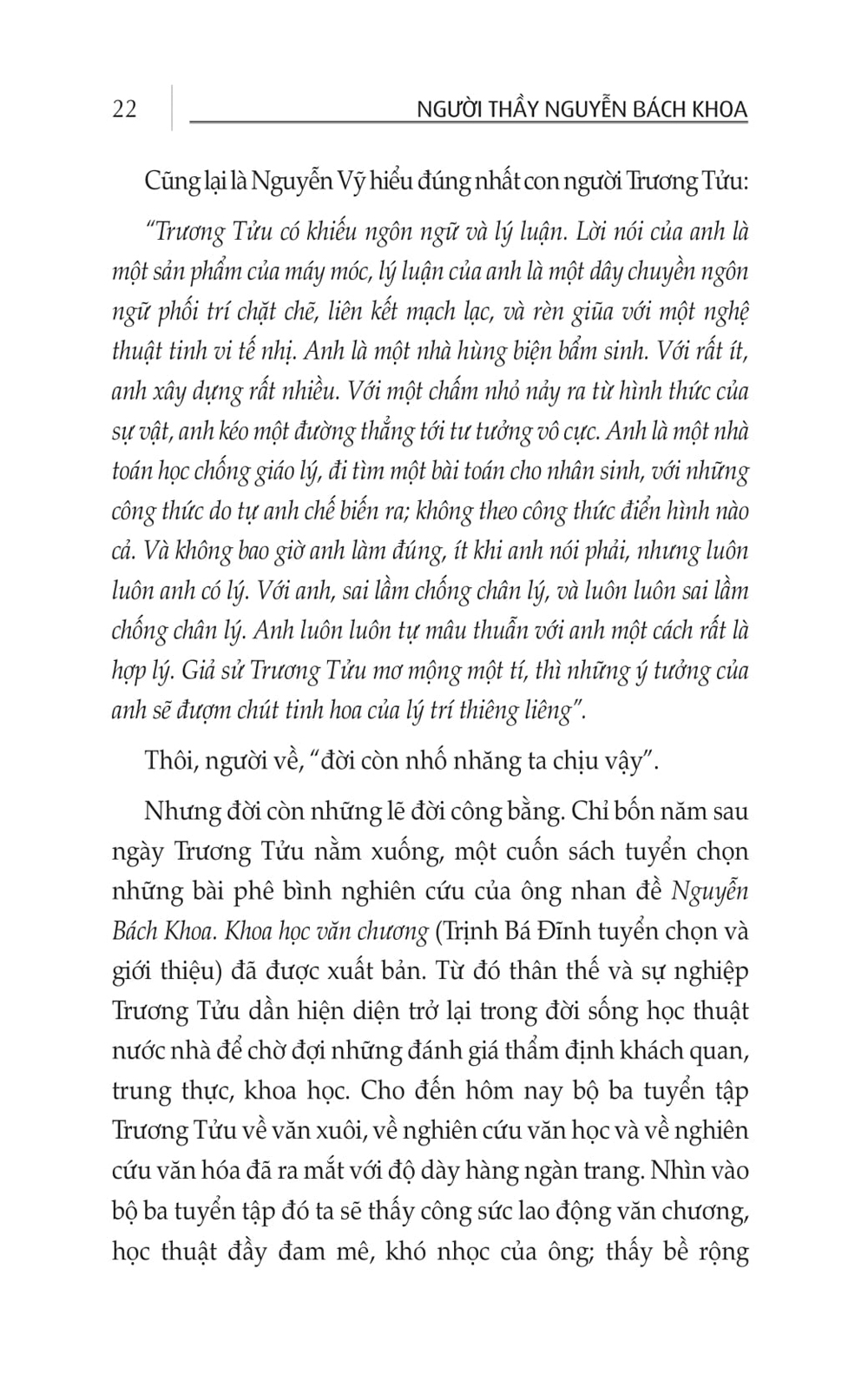 Mua tại TiktokNhà văn – Giáo sư Nguyễn Bách Khoa – Trương Tửu (1913-1999) là một trong những nhà lý luận phê bình tài ba nhất của thế hệ tiền chiến, một trong những người đi tiên phong trong lãnh vực phê bình văn học, ông còn sáng tác một loạt tiểu thuyết. Người thầy Nguyễn Bách Khoa là những trang viết về cuộc đời và sự nghiệp, những nghiên cứu học thuật và sáng tác, những hồi ức, kỷ niệm về ông…