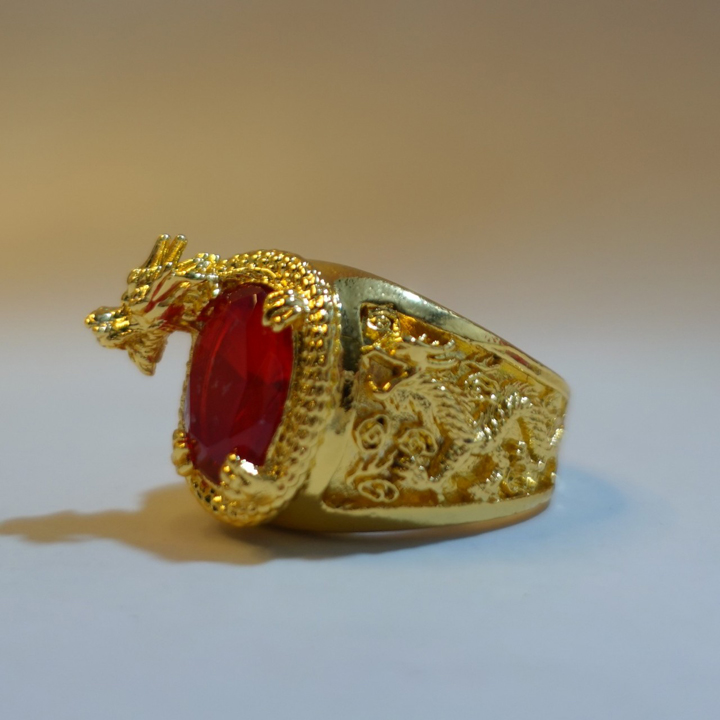 Chất liệu Thân Nhẫn: Hợp kim Titanium Chất liệu đá: Đá Zircon nhân tạo, kiểu dáng kim cương Thiết kế: Khắc rồng trên thân và mặt nhẫn, tinh xảo, chi tiết. Công dụng: Trang sức,