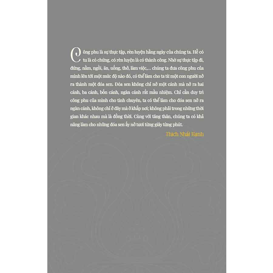 “Công phu là sự thực tập, sự rèn luyện hằng ngày của chúng ta. Hễ có tu là có chứng, có rèn luyện là có thành công. Nhờ sự thực tập đi, đứng, nằm, ngồi, ăn, uống, thở, làm việc,… chúng ta đưa công phu của mình lên tới một mức độ nào đó, có thể làm cho ta từ một con người nở ra thành một đóa sen. Đóa sen không chỉ nở một cánh mà nở ra hai cánh, ba cánh, bốn cánh, ngàn cánh rất mầu nhiệm. Chỉ cần duy trì công phu của mình cho tinh chuyên, ta có thể làm cho đóa sen nở ra ngàn cánh, không chỉ ở đây mà ở khắp nơi; không phải trong những thời gian khác nhau mà là đồng thời. Cùng với tăng thân, chúng ta có khả năng làm cho những đóa sen ấy nở tươi từng giây từng phút.” (Thích Nhất Hạnh)