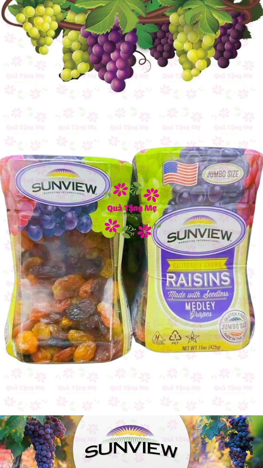 - Nho khô Mỹ Sunview 425g là thương hiệu nổi tiếng khắp thể giới với những lợi ích to lớn cho sức khỏe, trong nho khô có chứa hàm lượn cao Vitamin B, C acid folic và nhiều dưỡng chất.