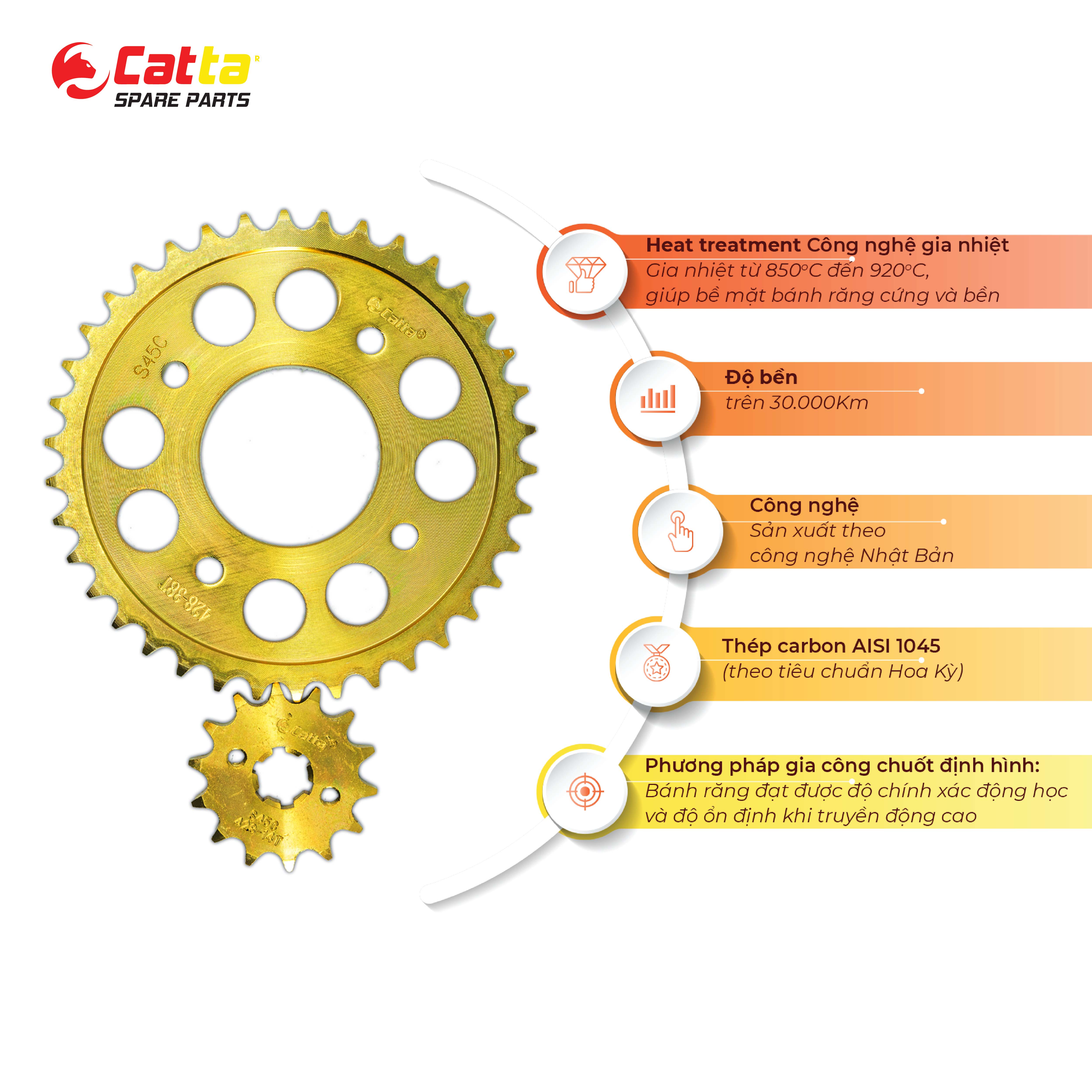Sên (xích) CATTA: Chi tiết các bộ phận cấu hình sợi sên đều đạt theo tiêu chuẩn yêu cầu theo xe với Pin: 30CrMnTi; Bush: 20Mn steel; Roller: 10# steel. Sên được gia nhiệt nhiều tầng (điều mà đa số các sản phẩm sên khác trên thị trường chưa có), giúp sên (xích) tăng độ bền, khả năng chịu tải cao hơn và lâu dãn hơn. Sên có độ ma sát thấp khi quay với tốc độ cao do đó giúp giảm hao mòn nhông dĩa, giảm tiếng ồn cũng như giảm được tỷ lệ sên bị nhảy khỏi nhông dĩa trong quá trình sử dụng (nhất là khi xe thiếu bảo trì bảo dưỡng thường xuyên).