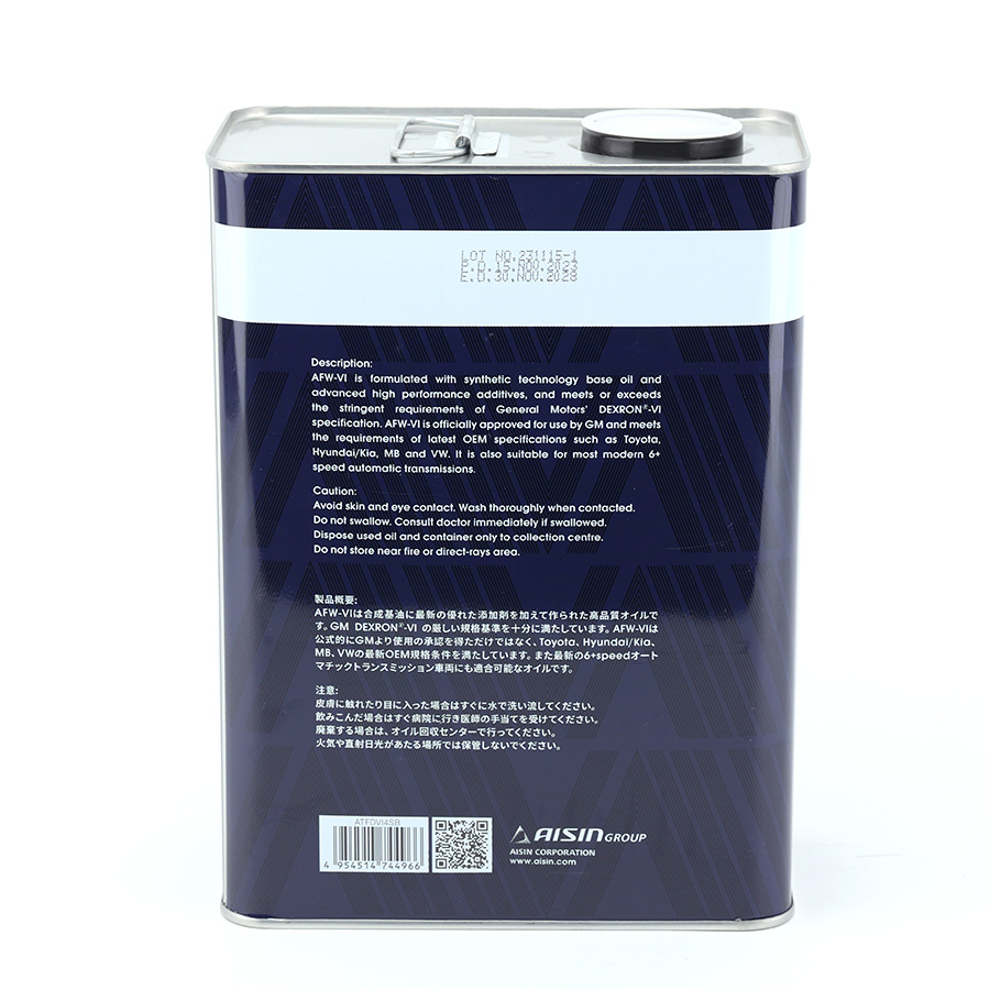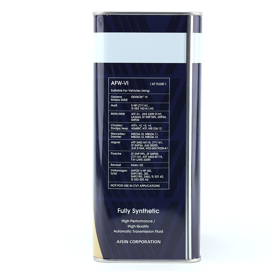 - Nhớt hộp số tự động AISIN ATFDVI1P ATF-VI Dexron VI 4L được chế tạo bằng dầu gốc công nghệ tổng hợp và các phụ gia hiệu suất cao tiên tiến, đáp ứng vượt trên yêu cầu nghiêm ngặt về đặc điểm kỹ thuật DEXRON-VI của General Motors. Aisin AFW-VI cũng đáp ứng các yêu cầu về thông số kỹ thuật OEM mới nhất như Toyota, Hyundai / Kia, MB và VW. Sản phẩm cũng phù hợp cho hầu hết hộp số tự động hiện đại 6+.