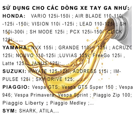 Khối lượng: 120ml Xuất xứ: indonesia Thành phần: dầu gốc khoáng và các phụ gia Phù hợp với hộp số (lap) xe tay ga Airblade,Click,Vario,Vision,SH,NVX,Attila,Vespa,… Giảm ồn,giảm hú lap. Sử dụng 3000 thay.