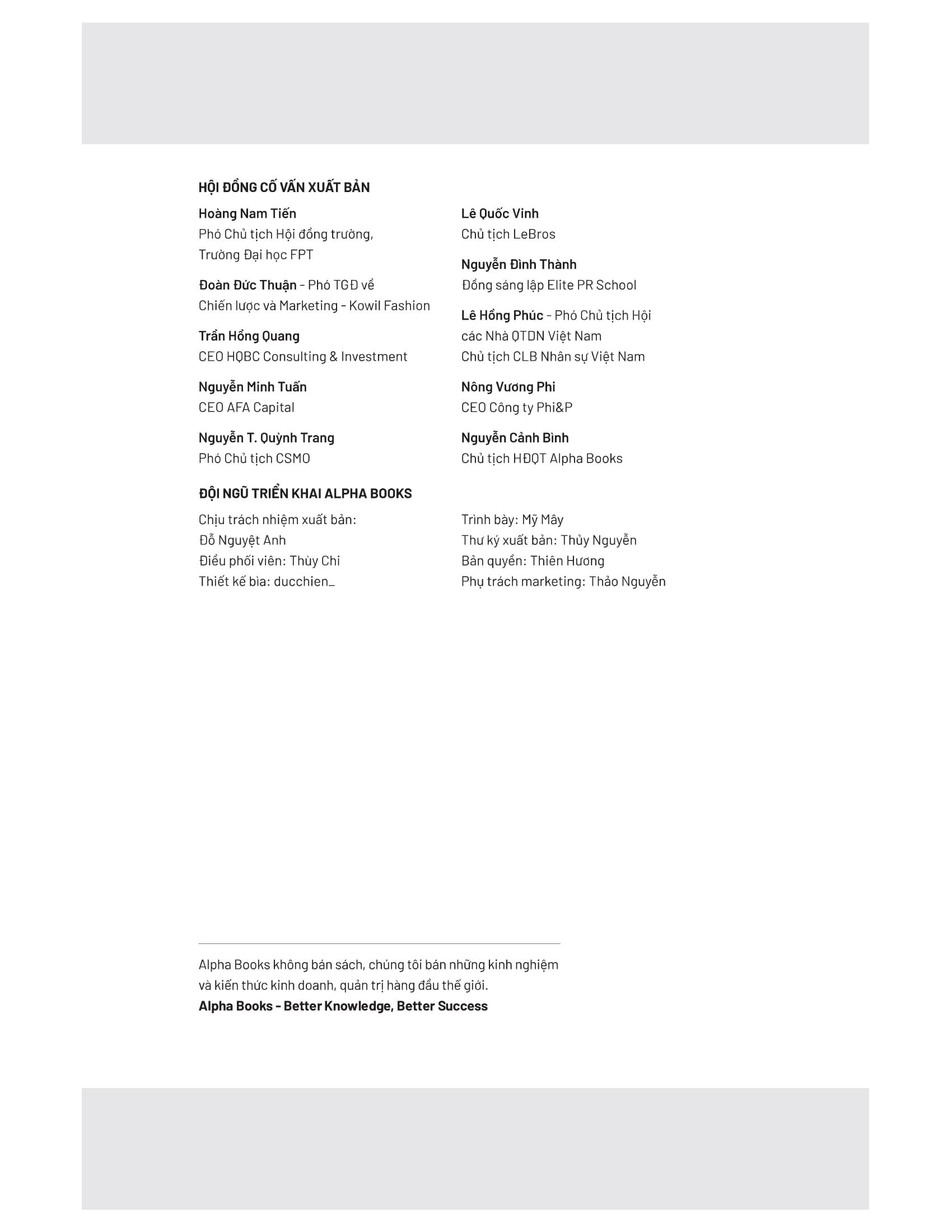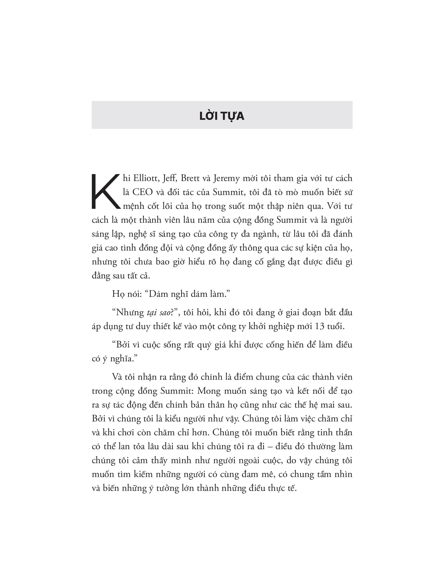 - Phong cách viết cuốn hút: Ngôn ngữ trong sách dễ hiểu, gần gũi, dí dỏm giúp độc giả thấy thoải mái và hứng thú. IV. GIỚI THIỆU TÁC GIẢ: Elliott Bisnow, Brett Leve, Jeff Rosenthal, Jeremy Schwartz Bốn tác giả cũng là đồng sáng lập Summit - cộng đồng những nhà sáng tạo và lãnh đạo tài năng trên khắp thế giới. Summit hiện đang là một trong những sự kiện có quy mô lớn nhất và ảnh hưởng nhất trên thế giới. Những người từng tham gia các sự kiện của Summit có thể kể đến như: Jeff Bezos, Richard Branson, Quincy Jones, Ted Turner, Sam Altman, Tony Hsieh, Evan Williams, Garrett Camp, Jessica Alba... V. CÁC TRÍCH ĐOẠN HAY