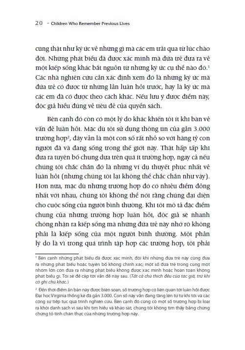 Công trình nghiên cứu của Tiến sĩ Stevenson còn đưa ra một cái nhìn tổng quan về lịch sử của niềm tin vào luân hồi, các bằng chứng củng cố niềm tin này thông qua các vết bớt, dị tật bẩm sinh… Cả những thành tựu mới trong lĩnh vực di truyền học cũng được tác giả khéo léo lồng ghép vào quyển sách.