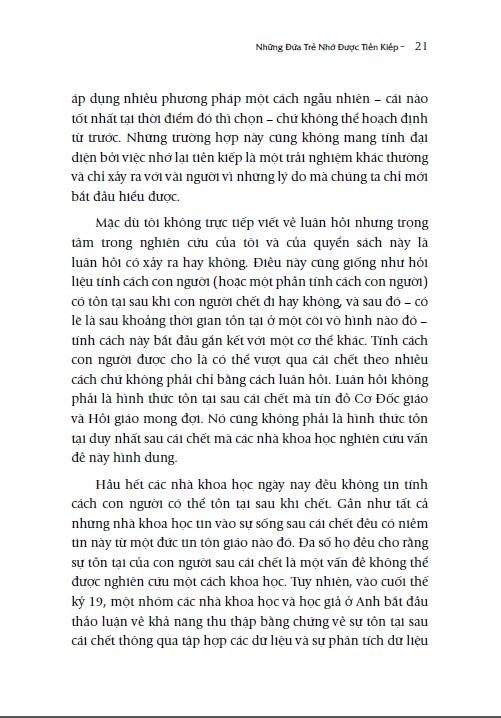“Những đứa trẻ nhớ được tiền kiếp” không trực tiếp bàn về luân hồi mà hướng trọng tâm đến việc nghiên cứu các dấu hiệu chứng tỏ ký ức của một người vẫn tồn tại sau khi chết. Thông qua 11 chương sách, tác giả đã đưa ra nhiều bằng chứng khoa học thuyết phục nhất chứng minh ký ức của chúng ta vẫn tồn tại sau khi chết. Ông tin rằng, con người có thể nhớ lại tiền kiếp sau khi được tái sinh vào một kiếp sống mới.