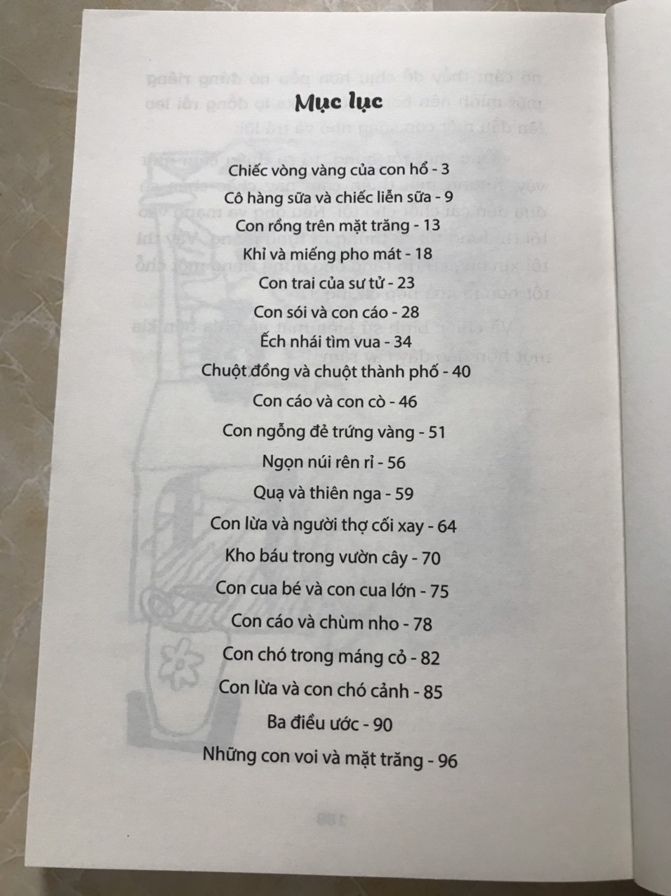 Có một chú bé chăn cừu nhút nhát kêu “Chó sói! Chó sói!”. Một con cáo giỏi chê “Chùm nho xanh!”. Có con ngỗng đẻ trứng vàng và cuộc thi giữa rùa và thỏ. Rồi chuyện tình bạn giữa ong mật và chim bồ câu, chuyện anh chàng keo kiệt; kho báu của người cha để lại…