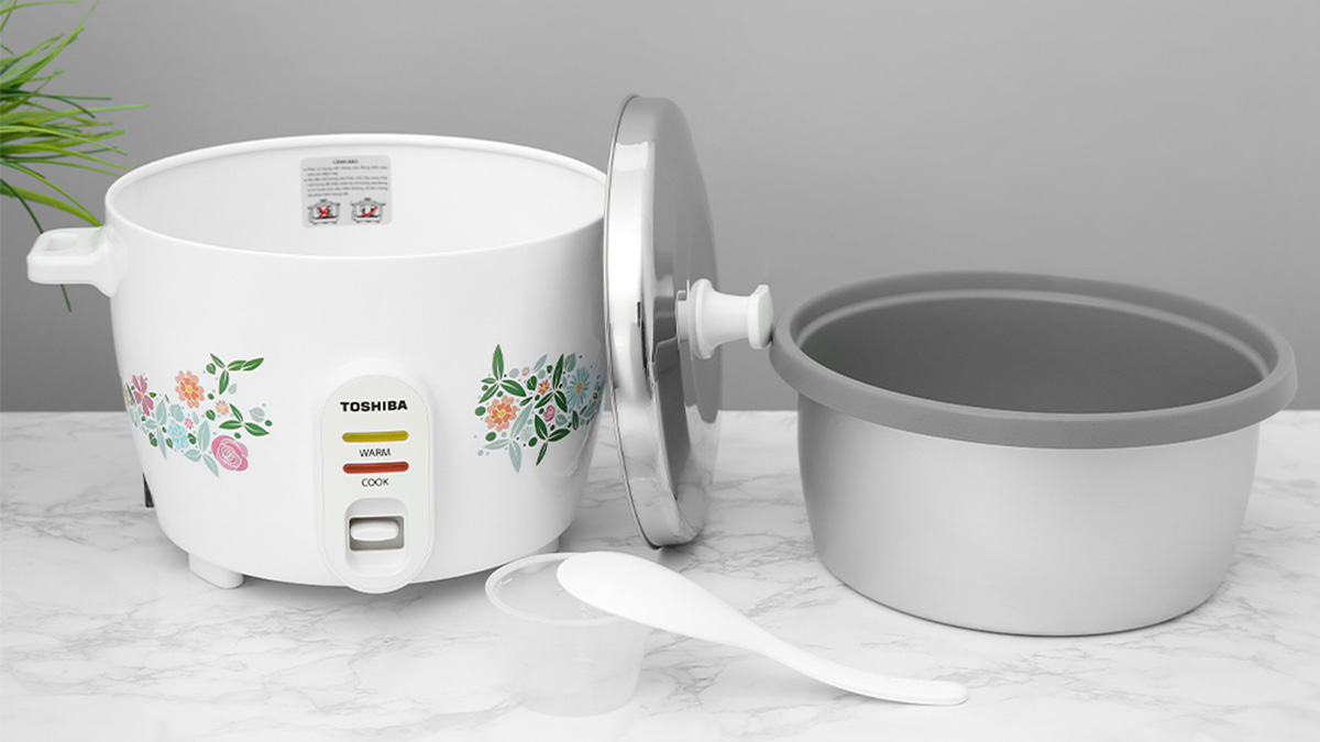 Nồi cơm điện Toshiba kiểu dáng mềm mại, họa tiết trang nhã, thiết kế nắp rời với dung tích 1.8 lít dùng cho gia đình 4 - 6 thành viên Vỏ nồi bằng thép phủ sơn tĩnh