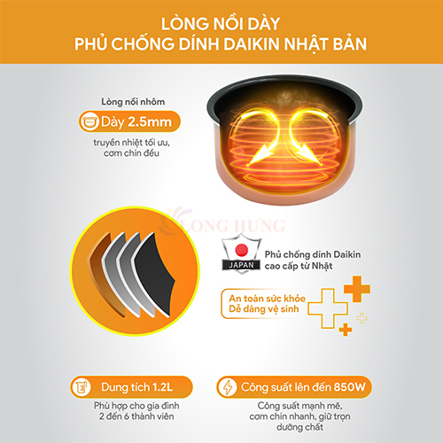 Lòng nồi tráng nhiều lớp hợp kim ép dọc rất dày dặn và bền Mâm nấu từ với công suất là 1455W Màn hình điện tử thông minh có nhiều chế độ: nấu cơm, cháo,