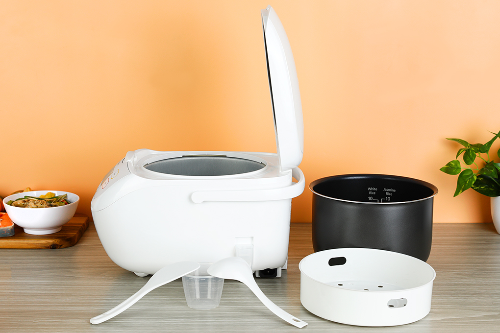 ️ Hẹn giờ lên đến 24 tiếng, với khóa an toàn ️ Chất liệu: + Cốc đong gạo, muỗng múc cơm, xửng hấp bằng chất liệu nhựa PP an toàn khi tiếp xúc thực phẩm