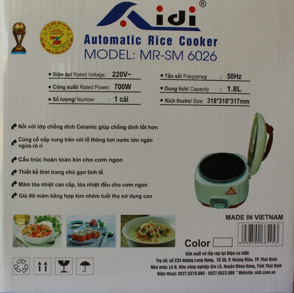 Nồi Cơm Điện Nắp Gài Thân Nhựa Ủ Đa Chiều Aidi MR-SM 6026 (1,8 lít) - Màu Ngẫu Nhiên- Chính Hãng được trang bị một mâm nhiệt lớn cùng công suất nồi 700W giúp nhiệt tỏa đều làm cơm chín đều, mềm và ngon hơn.Dung tích 1,8L phù hợp với gia đình 4-6 người.