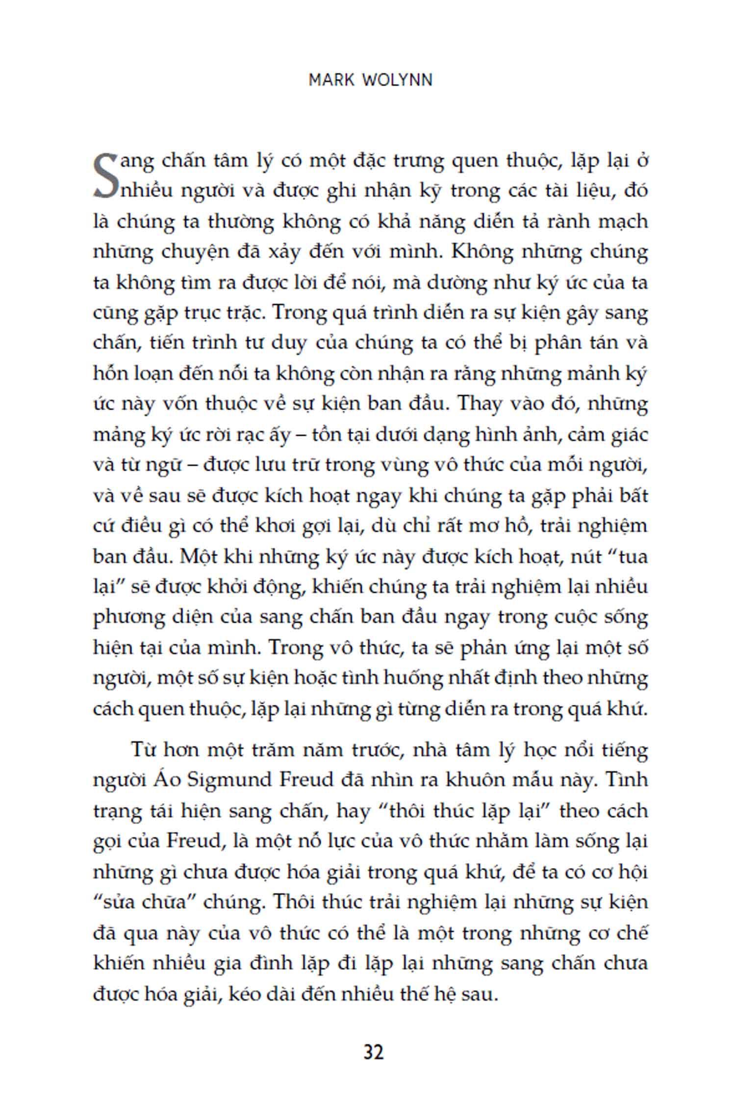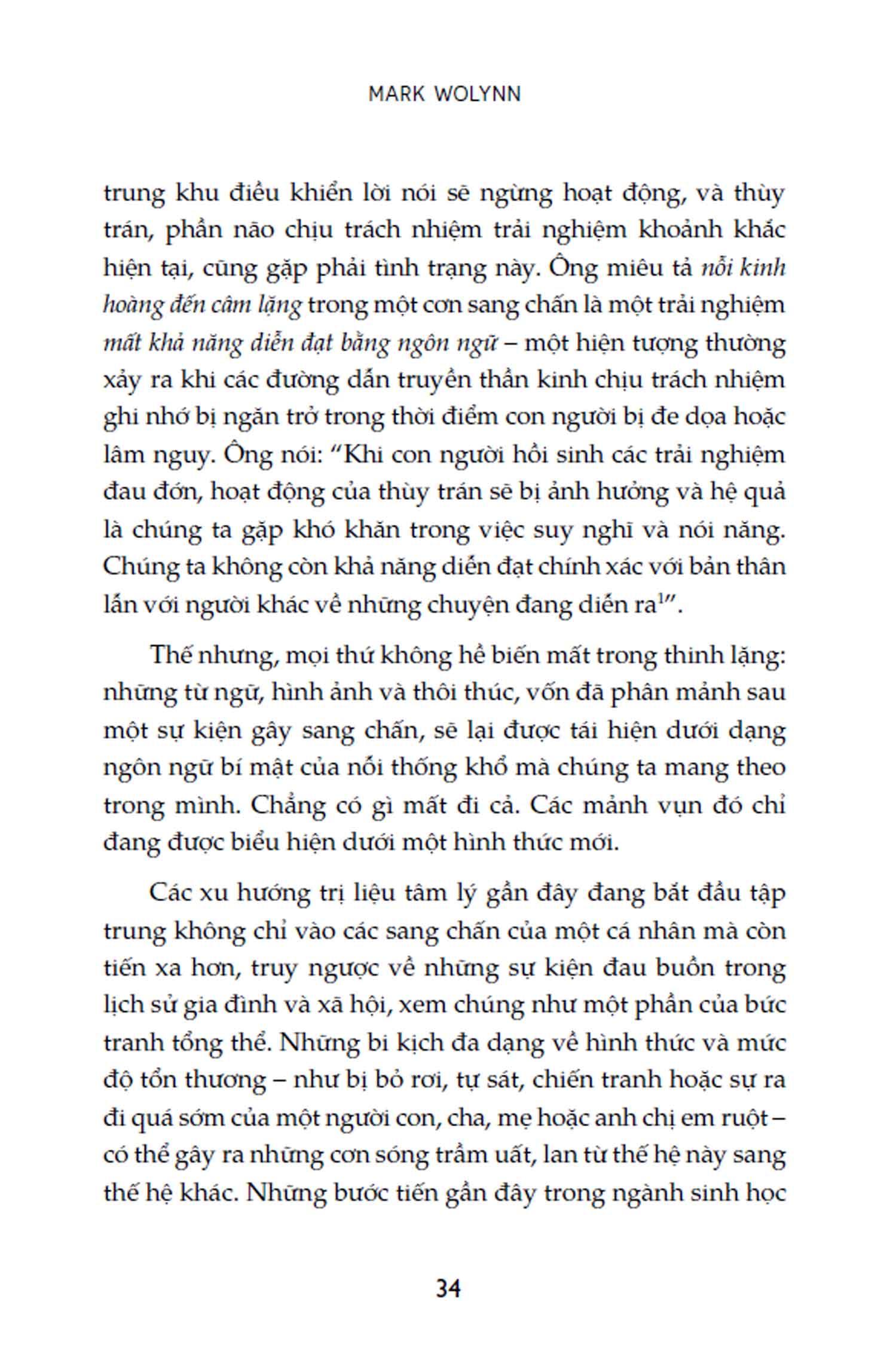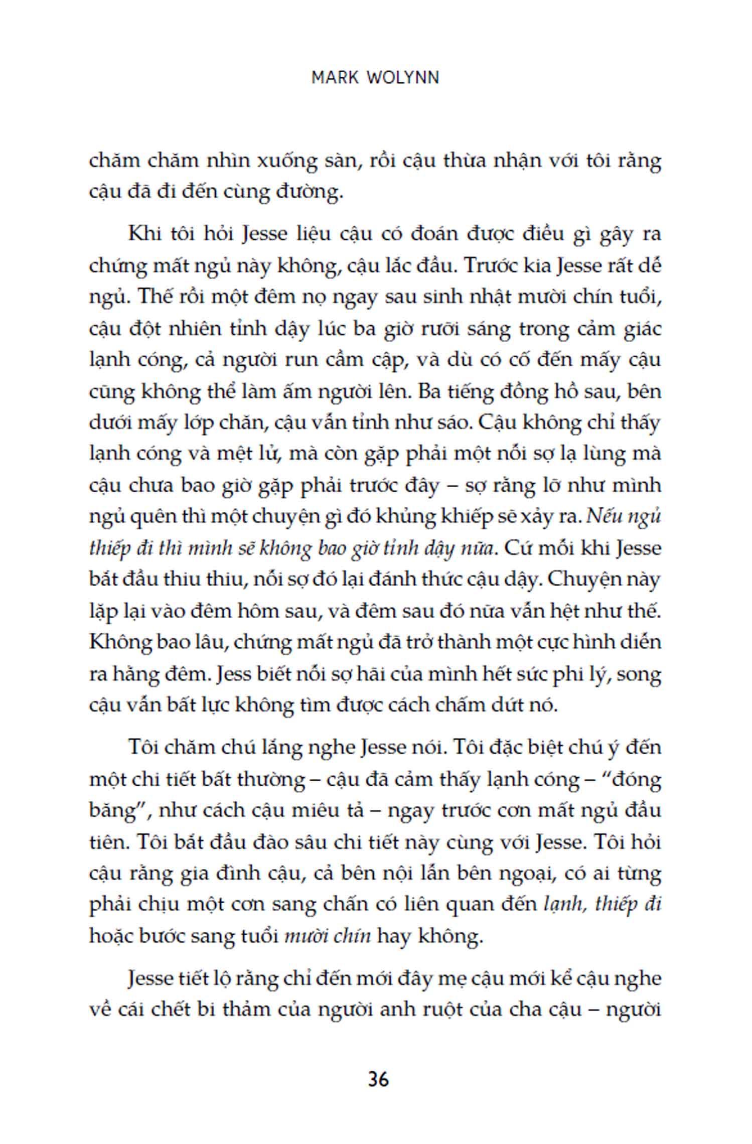 Bằng trải nghiệm cá nhân và kinh nghiệm làm việc cùng các thân chủ, tác giả Mark Wolynn sẽ dẫn dắt độc giả đi qua hành trình truy tìm nguồn gốc của những cảm xúc, nỗi đau, nỗi sợ vô thức và tìm cách hóa giải nỗi đau còn bị bỏ mặc.