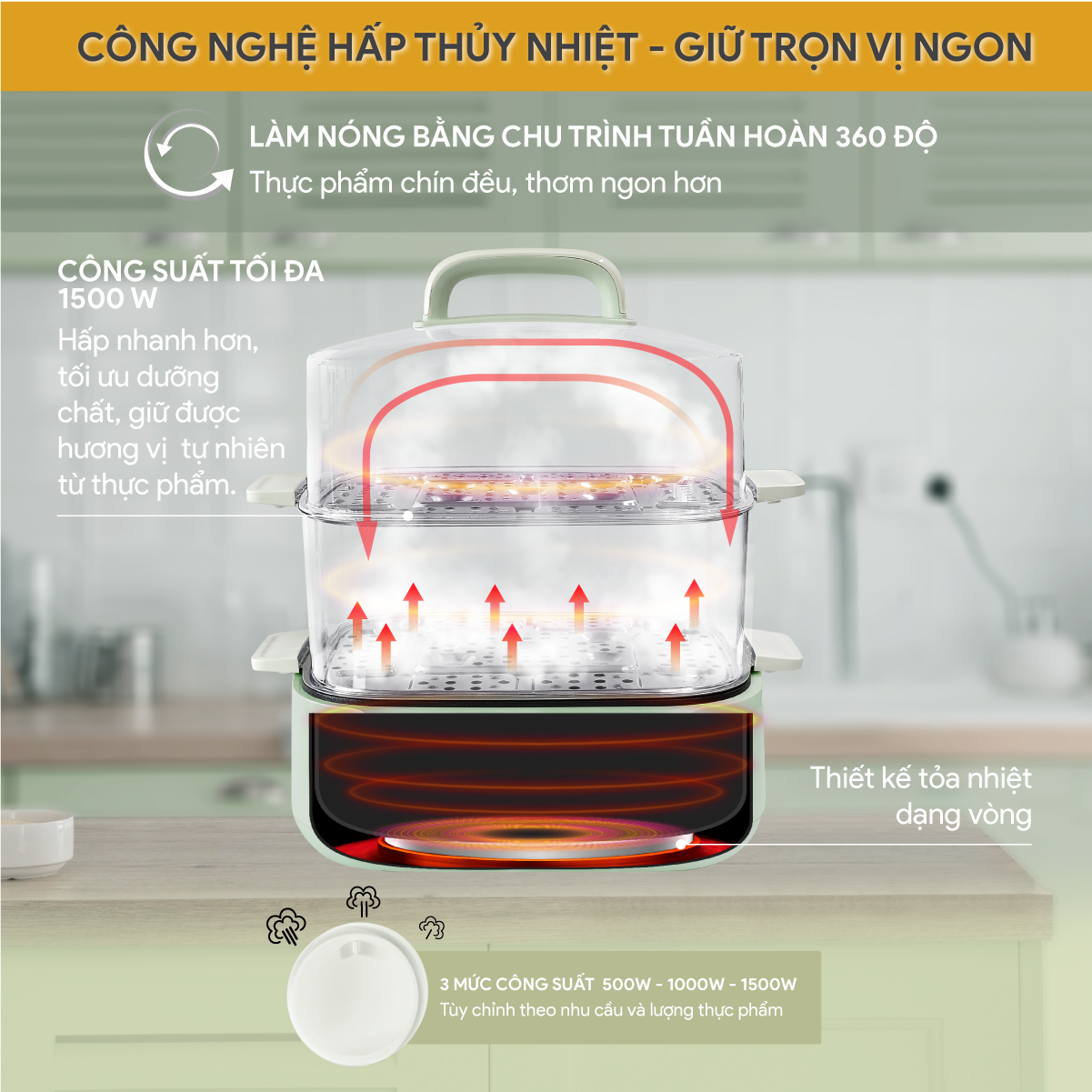 TÍNH NĂNG NỔI BẬT CỦA SẢN PHẨM – Thiết kế 3 tầng với dung tích lên đến 10,5 lít, có thể hấp cùng lúc nhiều loại thực phẩm. – Lồng hấp bằng nhựa PP cao