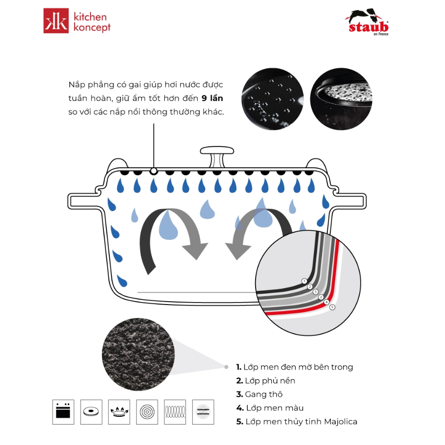 • Nắp nồi được thiết kế đặc biệt, giúp hơi nước được đối lưu liên tục, cùng tất cả hương vị tuyệt vời của món ăn được giữ lại bên trong nồi. Hơi nướcngưng tụ ở nắp nồi,rơi nhỏ giọt xuống và phân bổ đều vào thức ăn, quá trình này giúpviệc nấu ăn hiệu quả hơn 9 lần và giữ độ ẩm luôn cao hơn 20% so với các sản phẩm thông thường, giúp món ăn chín đều mềm mọng mà không bị khô. Hướng dẫn: