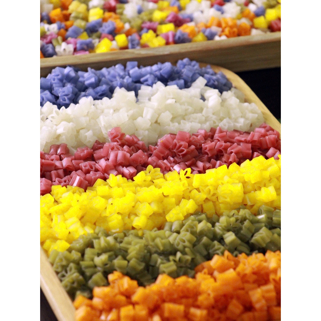 • 65% bột gạo, 30% bột năng, 5% rau củ (dành dành, bó xôi, lá cẩm, hoa đậu biếc, gấc), nước