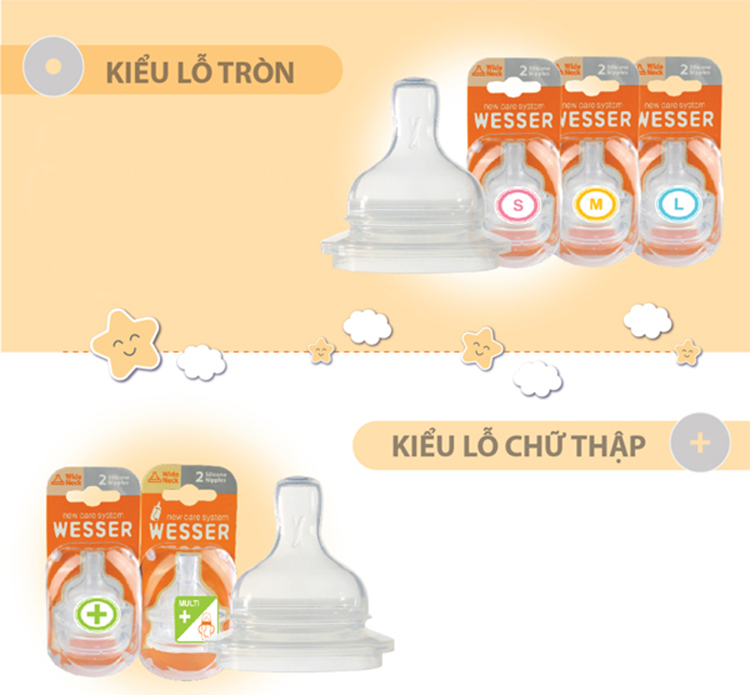 - Núm ty cổ rộng Wesser là một lựa chọn phổ biến cho bé sơ sinh và trẻ nhỏ, được thiết kế để giúp trẻ dễ dàng chuyển đổi giữa việc bú mẹ và bú bình sữa.
