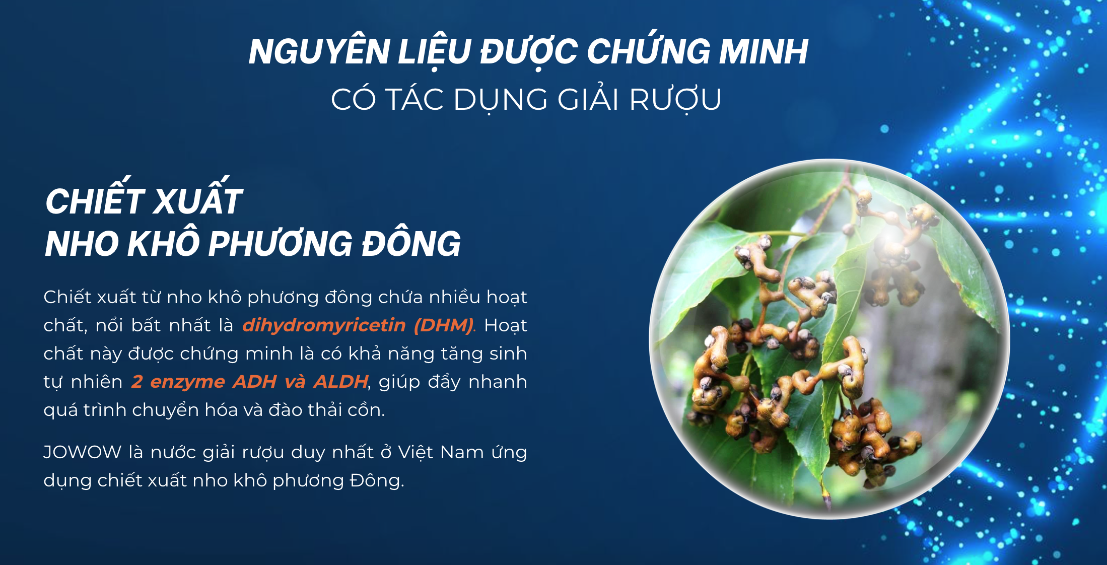 • Hovenia dulcis extract (Chiết xuất nho khô phương đông): một hoạt chất chính trong nguyên liệu này là DHM (Dihydromyricetin) đã được chứng minh lâm sàn là giúp tăng cường sản sinh ADH và ALDH.
