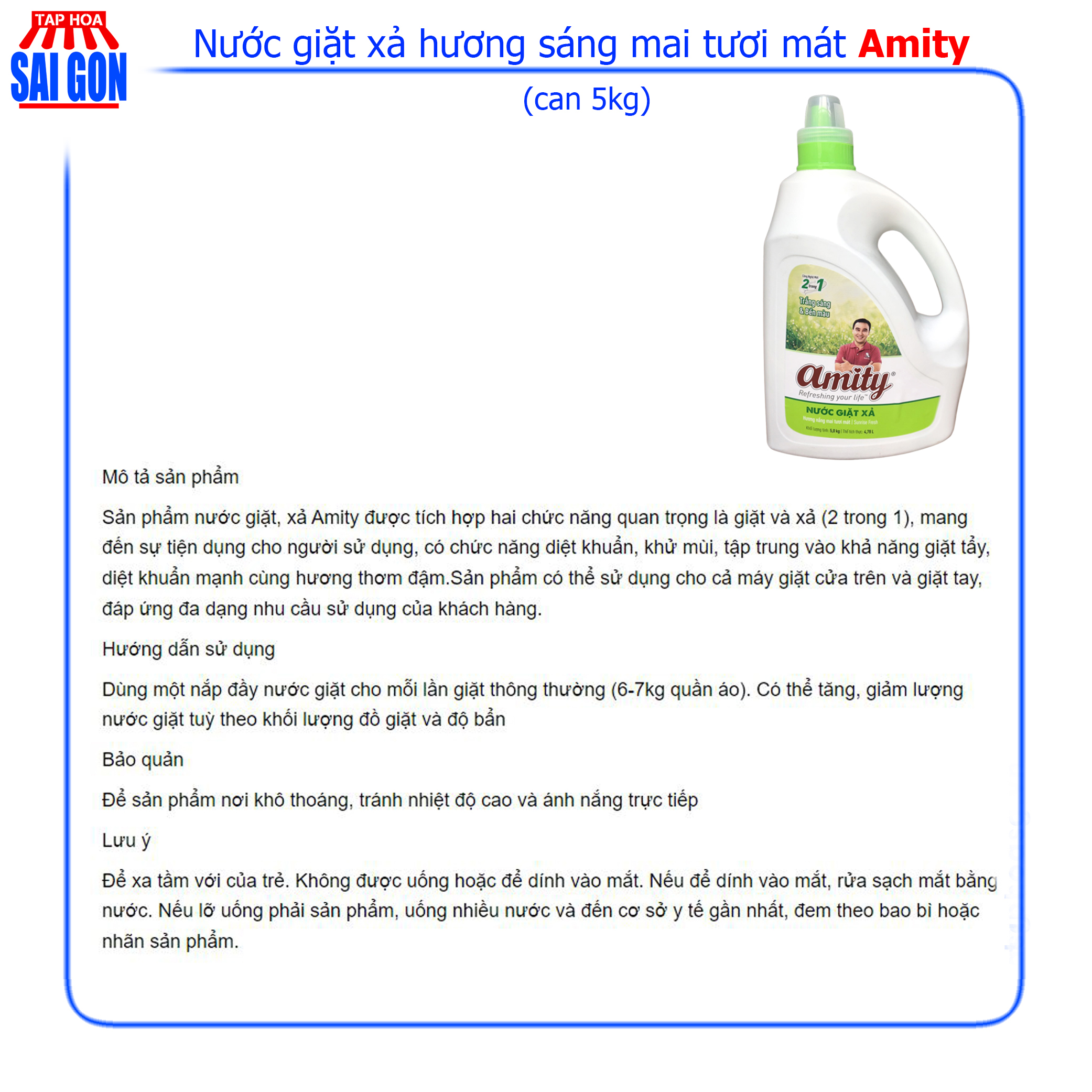 Nước giặt xả Amity hương nắng mai tươi mới (xanh lá) can 5kg loại bỏ mọi vết bẩn cho quần áo của gia đình Mô tả sản phẩm : Sản phẩm nước giặt, xả Amity
