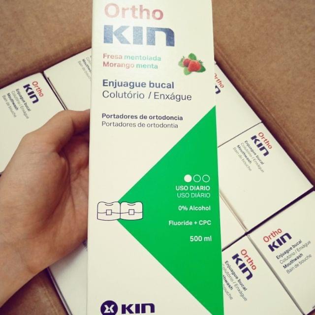 NƯỚC SÚC MIỆNG CHUYÊN DỤNG DÀNH CHO RĂNG CHỈNH NHA ORTHO KIN CHỨA FLUORIDE, CPC CÙNG CÁC KHOÁNG CHẤT BỔ SUNG CHO RĂNG VÀ NƯỚU CHẮC KHỎE CÙNG HƠI THỞ THƠM MÁT VỊ DÂU TÂY HÒA QUYỆN CÙNG HƯƠNG BẠC HÀ MÁT LẠNH CHO BẠN SỰ TỰ TIN TUYỆT ĐỐI DÙ ĐANG ĐEO MẮC CÀI. Bạn đang chỉnh nha và đang mắc phải vài vấn đề khó nói như hôi miệng, vàng răng, mắc cài dính đầy mảng bám hay bị lở miệng, viêm nướu…. Thực ra đây là vấn đề chung của tất cả bệnh nhân chỉnh nha. Điều quan trọng trong quá trình chỉnh nha để sau khi tháo mắc cài ra sẽ sở hữu một hàm răng trắng đều khỏe mạnh chính là chăm sóc răng miệng đúng cách trong thời gian niềng răng. Trong thời gian chỉnh nha, việc lựa chọn kem đánh răng phù hợp rất quan trọng. Kem đánh răng phải có những yêu cầu chuyên biệt cho việc chăm sóc răng niềng sao cho răng sạch và chắc, nướu khỏe. Ngoài ra, điều quan trọng nhất chính là mang đến cho mình một hơi thở thơm mát để tự tin giao tiếp, tự tin khẳng định đeo niềng không xấu. Nước súc miệng dành cho răng niềng Ortho Kin hội đủ tất cả những điều thiết bên trên cho bệnh nhân chỉnh nha. Với nồng độ Fluoride 500ppm giúp ngăn ngừa sâu răng, tái khoáng hóa men răng, cho răng chắc khỏe và sạch. Đặc biệt làm giảm tình trạng đốm trắng do sâu men răng sau khi tháo mắc cài. Nước súc miệng Ortho Kin có chứa một thành phần chất kháng khuẩn phổ rộng là Cetylpyridiniumchloride (CPC) hỗ trợ ngăn ngừa vi khuẩn phát triển, kiểm soát mảng bám, ngăn ngừa viêm nướu, viêm nha chu. Răng chỉnh nha luôn phải đối mặt với những vấn đề như nhiệt miệng, loét niêm mạc miệng do dây cung, mắc cài của khí cụ chỉnh nha làm tổn thương. Do đó, để làm dịu và làm cho vết thương tổn mau chóng lành lặn, nước súc miệng Ortho Kin có thêm thành phần Vitamin E và Provitamin B5 giúp tái tạo phục hồi các mô nướu, mô nha chu và các niêm mạc bị tổn thương, giúp nướu khỏe mạnh, bám sát chân răng. Đặc biệt, nước súc miệng Ortho Kin không chứa cồn nên không gây rát buốt và khô niêm mạc miệng. Ortho KIN có hương hỗn hợp giữa dâu tây và bạc hà giúp hơi thở thơm mát, cuốn bay mùi khó chịu, giúp bạn tự tin nở nụ cười trắng sáng. Điều quan trọng không kém những vấn trên chính là Ortho Kin có vị dâu hòa lẫn hương bạc hà the mát giúp người sử dụng có được hơi thở thơm mát, sàng khoái, cảm giác răng miệng luôn sạch và khỏe, mang lại tự tin trong giao tiếp cho người đang đeo mắc cài.   CÔNG DỤNG