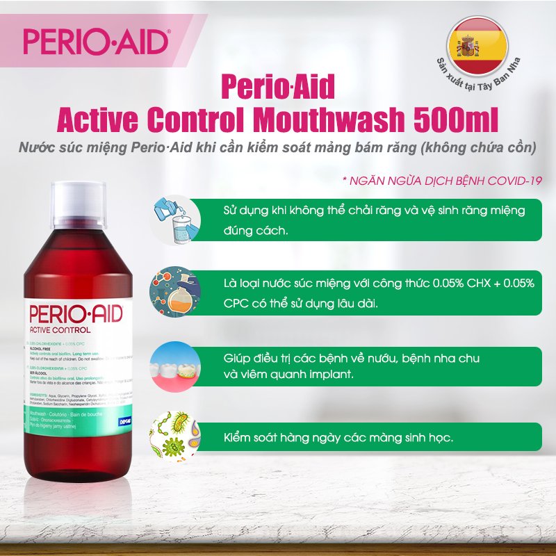 Nước súc miệng ngừa viêm nướu Perio-Aid Active Control 500ml Mô tả PERIO-AID là sản phẩm chăm sóc răng miệng được chỉ định để duy trì sức khỏe nha chu. Dòng sản phẩm có một công thức cụ thể kết hợp hai thành phần hoạt tính, chlorhexidine (CHX) và cetylpyridinium chloride (CPC), hoạt động đồng thời để đảm bảo kiểm soát tối đa mảng bám răng. Nước súc miệng Perio-Aid Active Control có chứa 0,05% Chlorhexidine Digluconate (CHX) và 0,05% Cetylpyridinium Chloride (CPC) đã được khoa học chứng minh hiệu quả tương đương với CHX 0,12%: nồng độ Chlorhexidine thấp nên đặc biệt thích hợp sử dụng hàng ngày để kiểm soát mảng bám, ngăn ngừa viêm nướu và viêm mô mềm quanh implant. – Không chứa cồn, không làm khô miệng, không kích ứng mô mềm. – Vị thanh mát dễ chịu, ngăn hôi miệng do viêm nướu và mảng bám. – Nước súc miệng có chứa chlorhexidine có thể tạm thời làm đổi vị giác, màu răng và lưỡi ở một vài người dùng, tác dụng phụ này sẽ giảm dần theo thời gian sử dụng. Vàng răng do chlorhexidine có thể được giảm thiểu hoàn toàn nhờ vào vệ sinh răng miệng cẩn thận. . Thông tin chi tiết của nước súc miệng Perio-Aid Active Control Model: Perio-Aid Active Control 500ml Tên thương hiệu: Perio-Aid Xuất xứ: Tây Ban Nha Dung tích: 500ML Thành phần: Aqua, glycerin, propylene glycol, xylitol, PEG-40 hydrogenated castor oil, methylparaben, chlorhexidine digluconate, cetylpyridinium chloride, potassium acesulfame, ethylparaben, sodium saccharin, neohesperidin dichalcone, aroma, CI 42051. Công dụng của nước súc miệng Perio-Aid Active Control –  Không chứa cồn, không làm khô miệng, không kích ứng mô mềm. – Vị thanh mát dễ chịu, ngăn hôi miệng do viêm nướu và mảng bám. – Nước súc miệng có chứa chlorhexidine có thể tạm thời làm đổi vị giác, màu răng và lưỡi ở một vài người dùng, tác dụng phụ này sẽ giảm dần theo thời gian sử dụng. Vàng răng do chlorhexidine có thể được giảm thiểu hoàn toàn nhờ vào vệ sinh răng miệng cẩn thận. . Hướng dẫn sử dụng của nước súc miệng Perio-Aid Active Control – Sau khi chải răng, súc miệng lại với 15ml dung dịch trong 30 giây, không được nuốt. Mỗi ngày súc miệng 2-3 lần, tốt nhất là sau khi ăn và trước khi đi ngủ. – Để đạt hiệu quả cao, có thể không súc lại với nước sau khi sử dụng và không nên ăn uống trong khoảng 30 phút sau khi súc miệng. – Bất kỳ kem đánh răng nào có chứa chất hoạt động bề mặt (như chất tạo bọt SLS) sẽ làm giảm tác dụng của Chlorhexidine, nếu bạn sử dụng các loại kem đánh răng này nên súc miệng nhiều lần với nước trước khi sử dụng nước súc miệng Perio.Aid Active Control. – Có thể dùng liên tục hằng ngày trong 6 tháng. Thông tin thương hiệu Perio-Aid