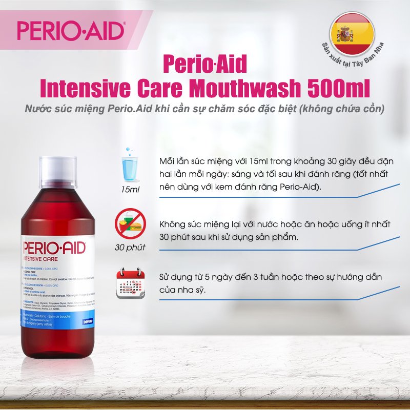 Nước súc miệng kháng khuẩn Perio-Aid Intensive Care 500ml PERIO-AID là sản phẩm chăm sóc răng miệng được chỉ định để duy trì sức khỏe nha chu. Dòng sản phẩm có một công thức cụ thể kết hợp hai thành phần hoạt tính, chlorhexidine (CHX) và cetylpyridinium chloride (CPC), hoạt động đồng thời để đảm bảo kiểm soát tối đa mảng bám răng. Nước súc miệng Perio-Aid Intensive Care chứa chlorhexidine digluconate 0.12% và Cetylpyridinium Chloride (CPC) 0.05% thích hợp trong việc kháng khuẩn, ngăn ngừa quá trình hình thành mảng bám, hỗ trợ điều trị viêm nướu và duy trì sức khỏe khoang miệng. Nhờ tác dụng hiệp đồng của Chlorhexidine và Cetylpyridinium Chloride, nước súc miệng Perio-Aid Intensive Care đảm bảo kiểm soát màng sinh học sau khi điều trị nha khoa. – Hỗ trợ điều trị và ngăn ngừa viêm nướu, viêm nha chu, hoặc sử dụng trước và sau khi thực hiện các thủ thuật cho răng miệng như nhổ răng, điều trị nướu, implant… – Kiểm soát và loại bỏ mảng bám, ngăn ngừa viêm nướu. – Chăm sóc nướu trong các trường hợp bị viêm loét do nhiệt miệng hoặc nhiễm nấm. – Hỗ trợ điều trị và phòng ngừa nhiễm trùng thể nhẹ vùng cổ họng. – Có thể dùng để sát khuẩn hàm tháo lắp. – Chứa Xylitol giúp giảm vi khuẩn và mảng bám, ức chế sự hình thành acid gây sâu răng, ngăn ngừa sâu răng hiệu quả. Thông tin chi tiết của nước súc miệng Perio-Aid Intensive Care Model: Perio-Aid Intensive Care 5000ML Tên thương hiệu: Perio-Aid Xuất xứ: Tây Ban Nha Dung tích: 500ML Hạn sử dụng: 24 tháng Thành phần: Aqua, Glycerin, Propylene Glycol, Xylitol, Chlorhexidine Digluconate, PEG-40 Hydrogenated Castor oil, CPC, Potassium Acesulfame, Sodium Saccharin, Neohesperidin Dichalcone, Aroma, C.l 42090 Công dụng của nước súc miệng Perio-Aid Intensive Care – Nước súc miệng hỗ trợ điều trị và ngăn ngừa viêm nướu, viêm nha chu, hoặc sử dụng trước và sau khi thực hiện các thủ thuật cho răng miệng như nhổ răng, điều trị nướu, implant… – Nước súc miệng kiểm soát và loại bỏ mảng bám, ngăn ngừa viêm nướu. – Nước súc miệng chăm sóc nướu trong các trường hợp bị viêm loét do nhiệt miệng hoặc nhiễm nấm. – Nước súc miệng hỗ trợ điều trị và phòng ngừa nhiễm trùng thể nhẹ vùng cổ họng. – Có thể dùng để sát khuẩn hàm tháo lắp. – Nước súc miệng chứa Xylitol giúp giảm vi khuẩn và mảng bám, ức chế sự hình thành acid gây sâu răng, ngăn ngừa sâu răng hiệu quả. Hướng dẫn sử dụng của nước súc miệng Perio-Aid Intensive Care – Mỗi ngày súc miệng 2 lần: sáng và tối sau khi đánh răng. Mỗi lần súc miệng với 15ml trong khoảng 30 giây – Sau khi sử dụng, không nên súc miệng lại với nước hoặc ăn uống ít nhất 30 phút sau khi ăn uống ít nhất 30 phút. – Tốt nhất khi dùng với kem đánh răng Perio-Aid Intensive Care. –  Chỉ sử dụng trong 5 ngày – 3 tuần hoặc theo sự hướng dẫn của nha sỹ. Thông tin thương hiệu Perio-Aid