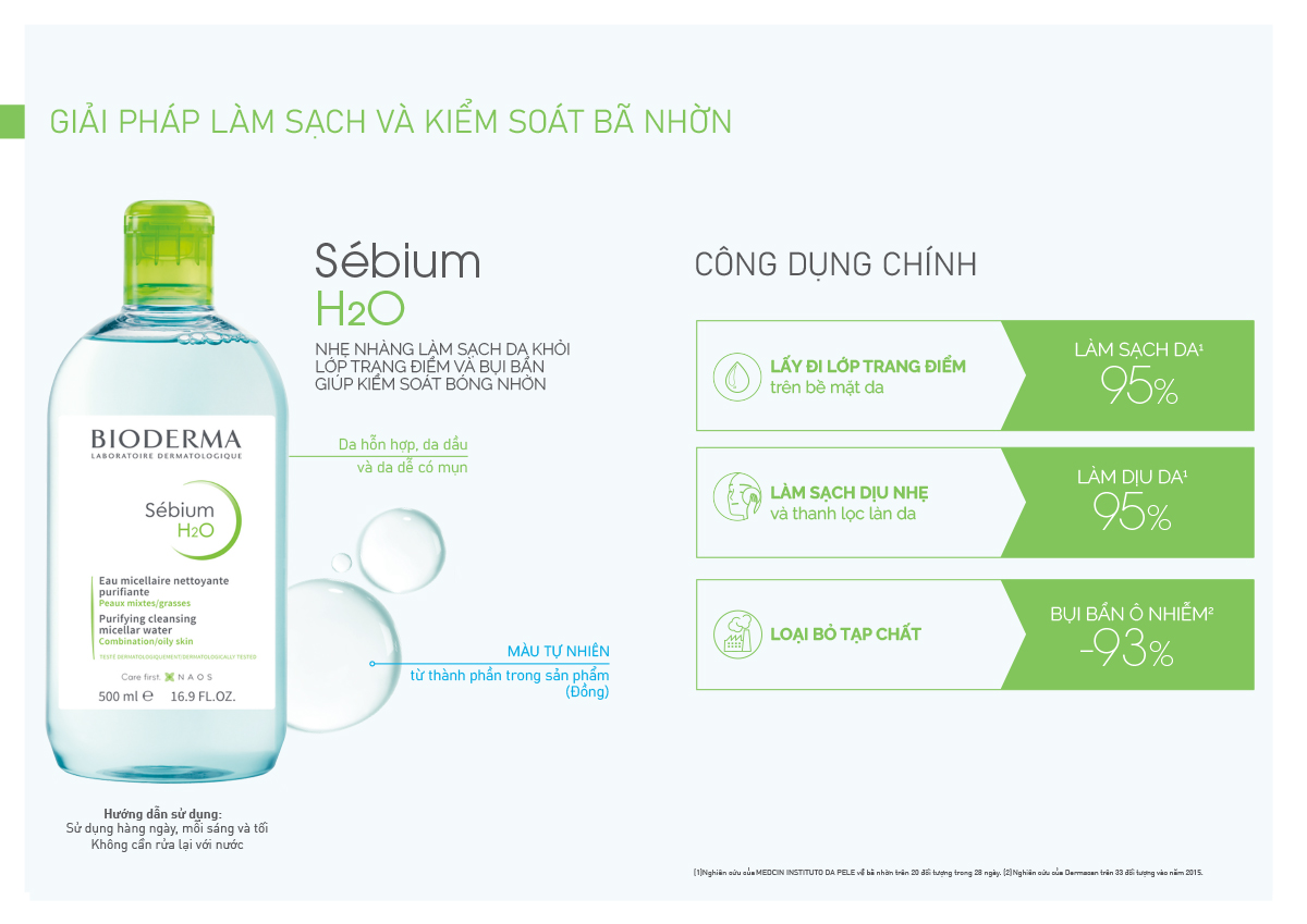 Bioderma Sébium H20 được biết đến rộng rãi trên toàn thế giới với những tác động giúp làm sạch da nhẹ dịu, nhẹ nhàng lấy đi các lớp trang điểm trên da mặt mà không gây kích ứng cho da, kể cả những làn da dễ nhạy cảm. Nằm trong bộ sản phẩm chăm sóc da nhạy cảm, dễ kích ứng của Bioderma, sản phẩm luôn được đảm bảo tính an toàn tuyệt đối cho sức khỏe của làn da. Sử dụng Bioderma Sébium để tẩy trang sau khi makeup là giải pháp giữ cho da luôn sạch và khỏe mạnh tự nhiên.
