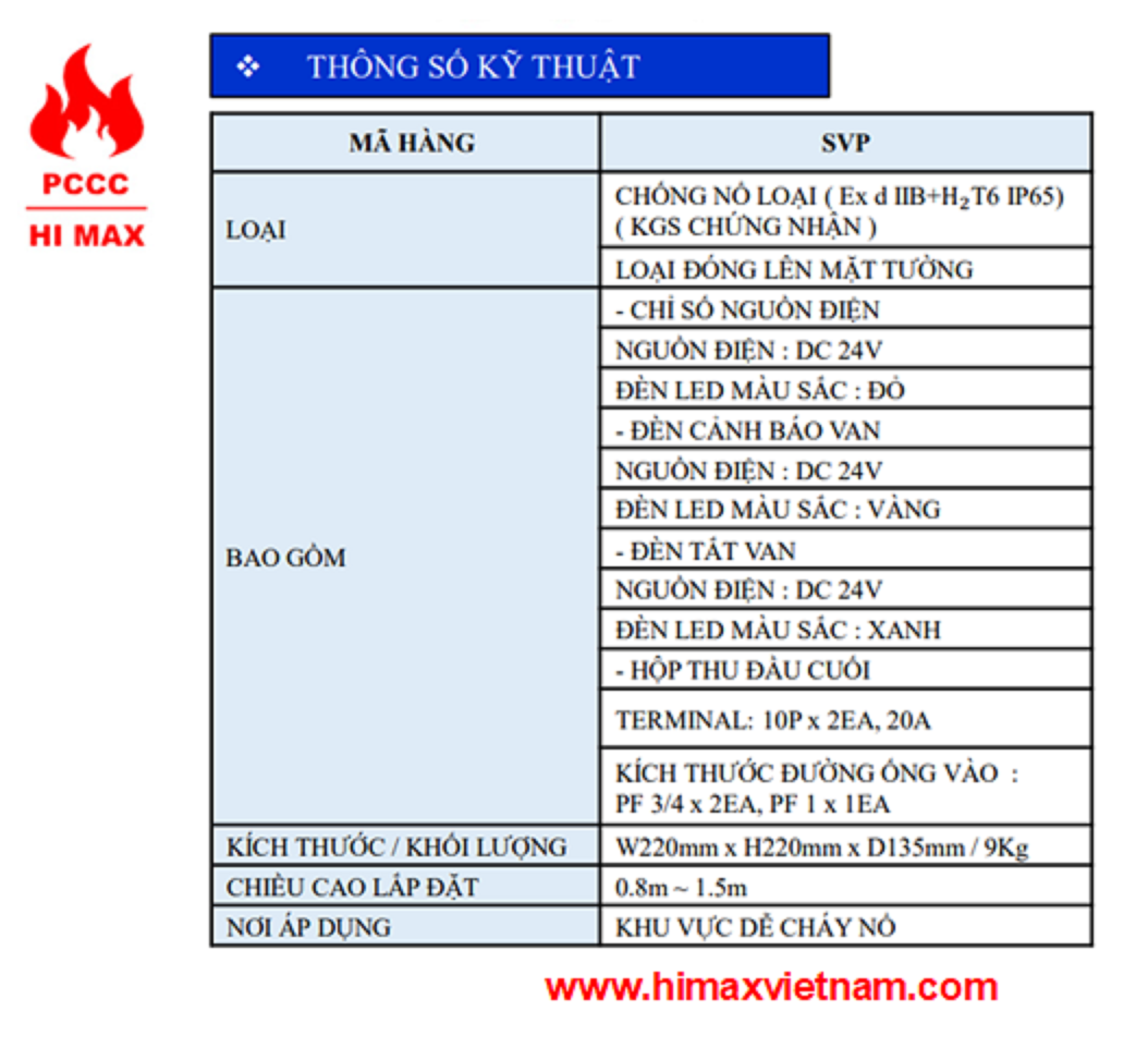 MÃ HÀNG: SVP LOẠI: CHỐNG NỔ ( Ex d IIB+T6 IP65 ) / ĐÓNG LÊN MẶT TƯỜNG BAO GỒM: - CHỈ SỐ NGUỒN ĐIỆN + NGUỒN ĐIỆN: DC 24V + ĐÈN LED MÀU SẮC: ĐỎ - ĐÈN CẢNH BÁO VAN + NGUỒN ĐIỆN: DC 24V + ĐÈN LED MÀU SẮC: VÀNG - ĐÈN TẮT VAN + NGUỒN ĐIỆN: DC 24V + ĐÈN LED MÀU SẮC: XANH - CẦU ĐẤU DÂY: 10P x 2EA, 20A - KÍCH THƯỚC ĐƯỜNG ỐNG VÀO:PF 3/4 x 2EA, PF 1 x 1EA KÍCH THƯỚC/KHỐI LƯỢNG: W220mm x H220mm x D135mm / 12Kg CHIỀU CAO LẮP ĐẶT: 0.8m ~ 1.5m NƠI ÁP DỤNG: KHU VỰC DỄ CHÁY NỔ #himax #pccc #baochay #hanquoc #vietnam #kiemdinh #hethongpccc #himaxvietnam #hethongbaochay #antoanchongno #baochayhimax #korea #thietbibaochay