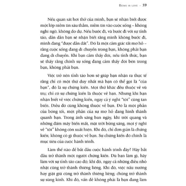 - Tỉnh thức khi yêu: Tình yêu trong trạng thái tỉnh thức có nghĩa là yêu một cách đầy nhận thức, hiểu rõ bản chất của tình yêu và của bản thân. Osho nhấn mạnh rằng, việc hiểu biết về chính mình và về người kia là sự khởi đầu của tình yêu thực sự. Điều này đòi hỏi sự trưởng thành, sự chín chắn trong cảm xúc và khả năng nhìn nhận mọi thứ một cách rõ ràng.