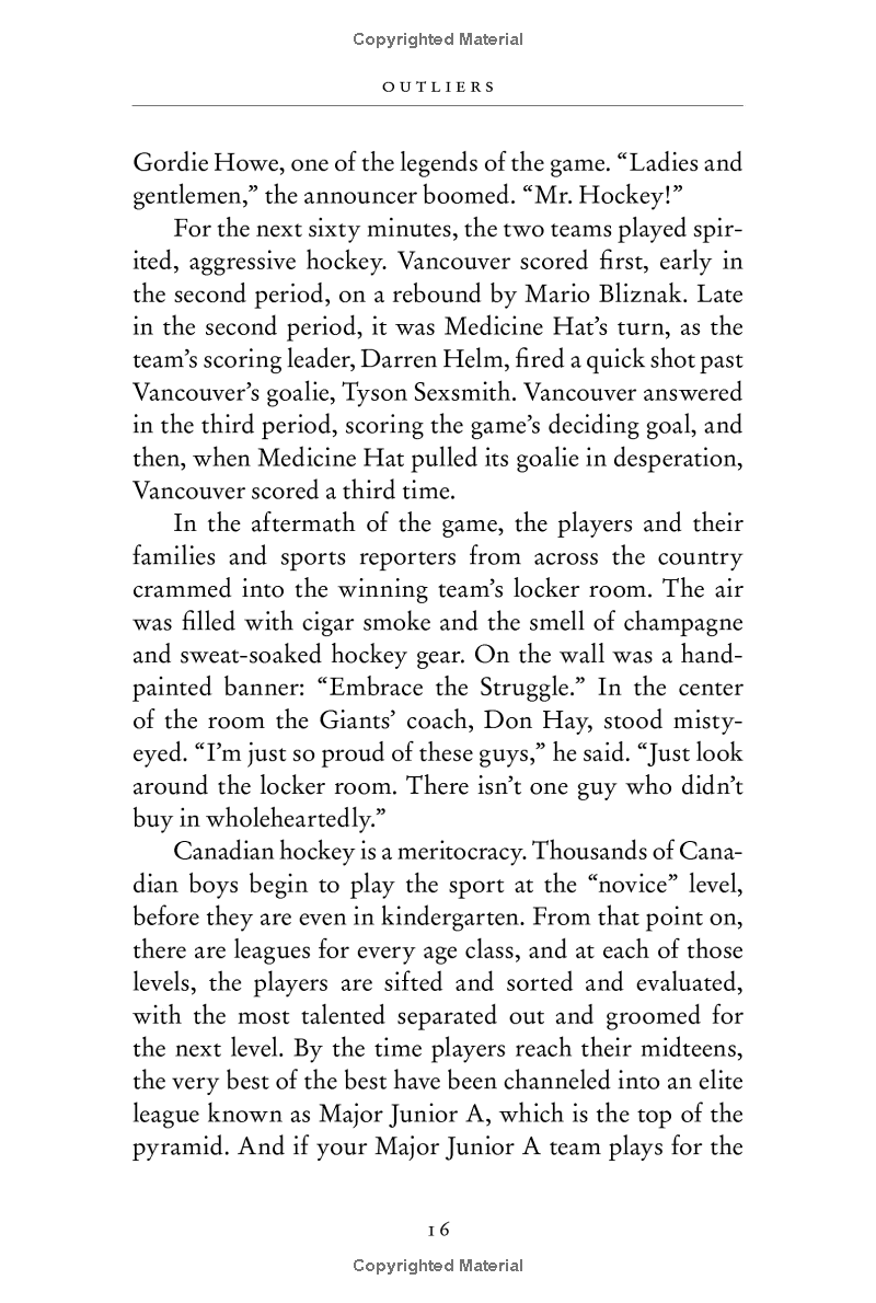 Why are people successful For centuries, humankind has grappled with this question. In this stunning new book, Gladwell takes us on an invigorating intellectual journey to show us what makes an overachiever. He reveals that we pay far too much attention to what successful people are like, and too little attention to where successful people are from: their culture, their family, and their generation. Gladwell examines how the careers of Bill Gates and the performance of world-class football players are alike; what top fighter pilots and The Beatles have in common; and why it is correct to say that the mathematician who solved Fermat's Theorem is not a genius