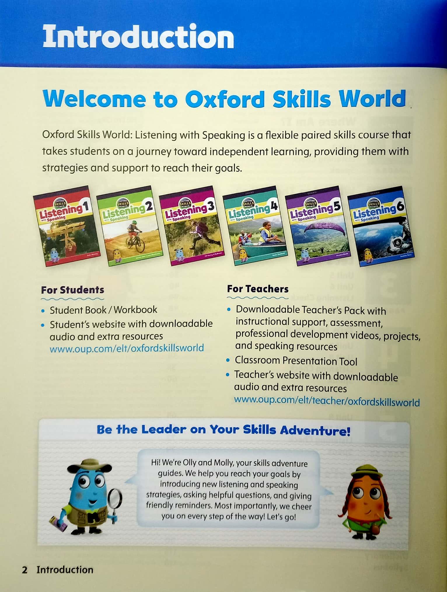 The Oxford Skills World: Listening with Speaking Student Book / Workbook has six topics, and each topic has two units. There are clear learning goals on every page, each topic follows the same structure, and on-the-page characters Olly and Molly keep young learners active and engaged with the material.