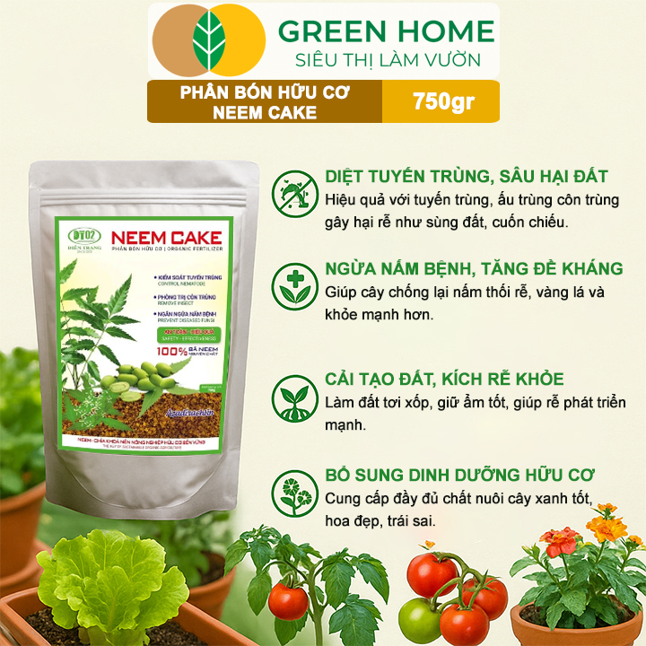 Phân Bón Hữu Cơ Neem Cake, GreenHome, Bao 750gr, Sinh Học Tự Nhiên Trị Tuyến Trùng, Sâu, Cải Tạo Đất