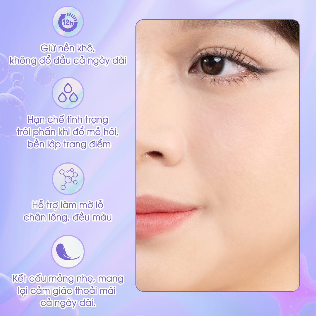 - Phấn phủ kiềm dầu, giảm bóng nhờn: Giữ lớp nền khô thoáng, không lo đổ dầu suốt cả ngày.