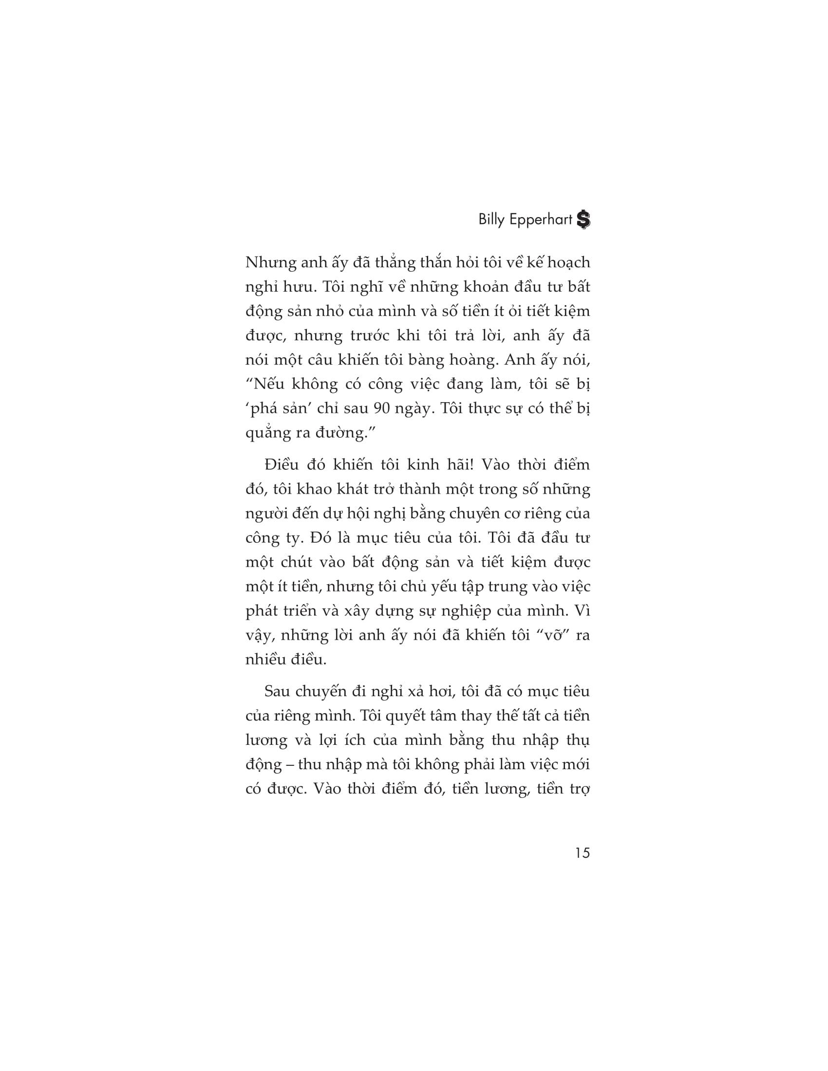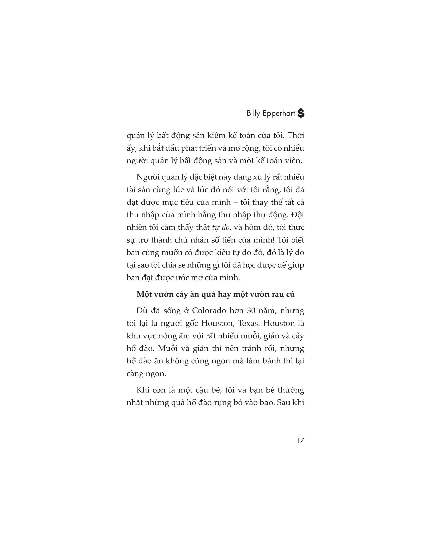 Tuy nhiên, bạn có thể rút ngắn đáng kể hành trình dài đằng đẵng ấy bằng cách tận dụng kinh nghiệm của những người khác. Nhưng nếu làm vậy, hãy đảm bảo rằng bạn tận dụng được kinh nghiệm của một chuyên gia. Và không thể phủ nhận, Billy Epperhart là một người như vậy. Không phải cứ là nhà đầu tư bất động sản có kinh nghiệm thì đều có thể truyền đạt các nguyên tắc đầu tư sinh lời mà người đọc có thể làm theo; Billy đã chắt lọc những kiến thức và kinh nghiệm của mình và trình bày sao cho thật dễ hiểu. Và quan trọng không kém, anh ấy đã truyền cảm hứng cho người đọc để họ muốn hành động và nỗ lực trở thành một nhà đầu tư thành công.